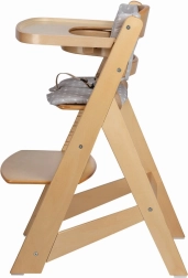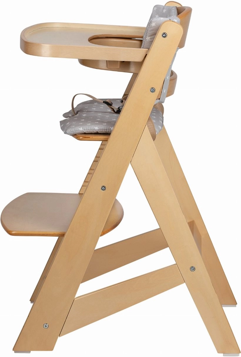 Il vassoio removibile e la barra di sicurezza in legno consentono un passaggio facile dal seggiolone alto alla sedia da tavolo. La cintura integrata a 3 punti e la comoda imbottitura aumentano la sicurezza e il comfort anche durante le sedute più lunghe.