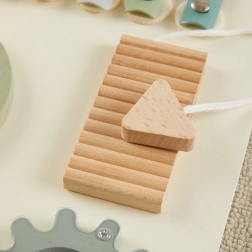 Xilofono, ingranaggi, labirinti, elementi scorrevoli e apribili, perline e sportellini con sorpresa: tutto invita i bambini all’esplorazione e sviluppa motricità fine e logica.