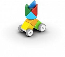 Elementi magnetici progettati appositamente si agganciano facilmente tra loro da diverse direzioni. I bambini così costruiscono senza sforzo una macchinina e altre forme, rafforzando la motricità fine.