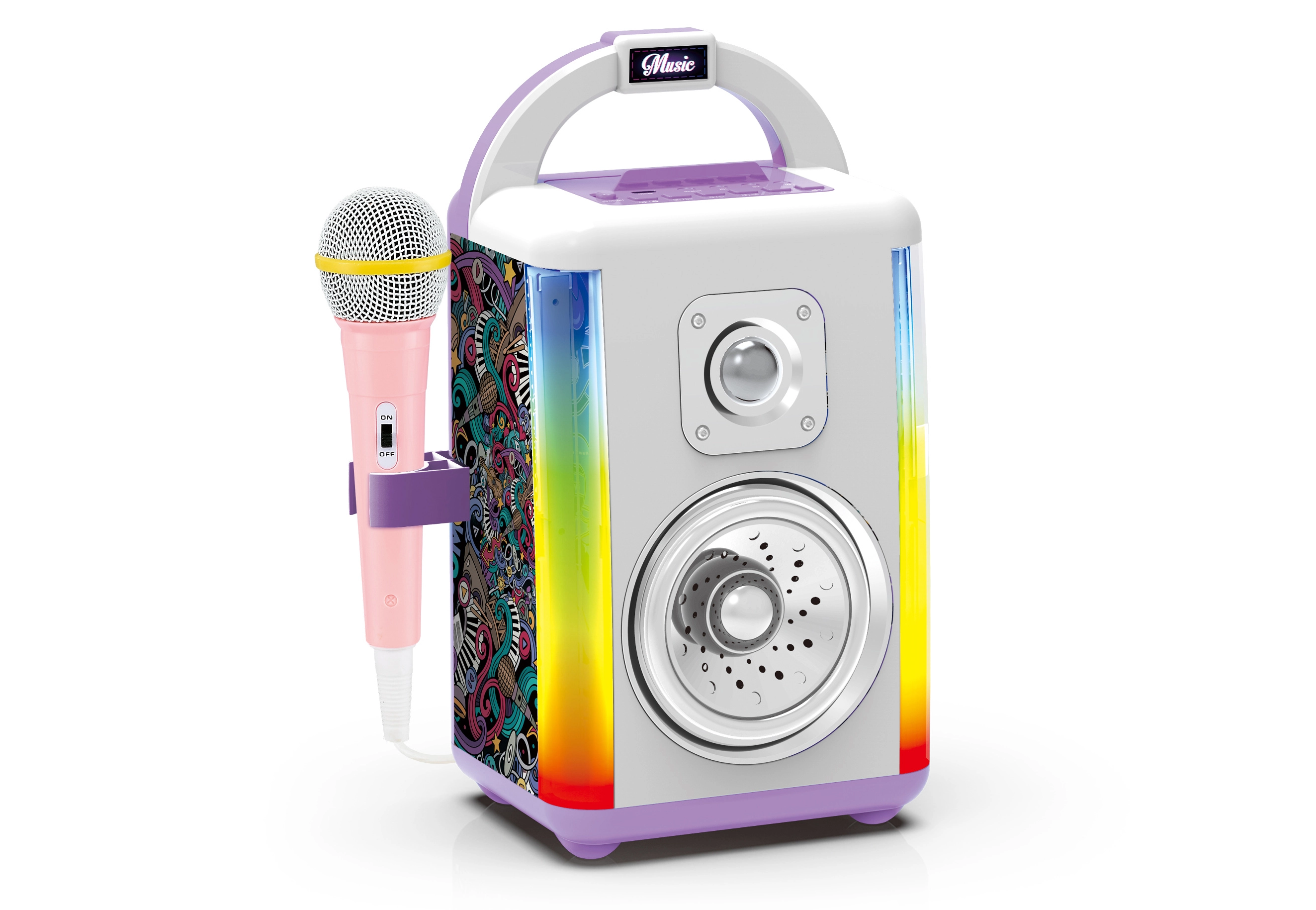 Goditi il karaoke a casa e il divertimento in viaggio con questo music box portatile alto 28 cm. Offre connessione Bluetooth, registrazione e cambio voce, fino a 10 canzoncine integrate, cinque modalità luminose e 4 livelli di volume. Non mancano ingresso AUX, porta per cuffie, possibilità di collegare 2 microfoni e una pratica modalità standby dopo 5 minuti di inattività. Nella confezione è incluso 1 microfono.