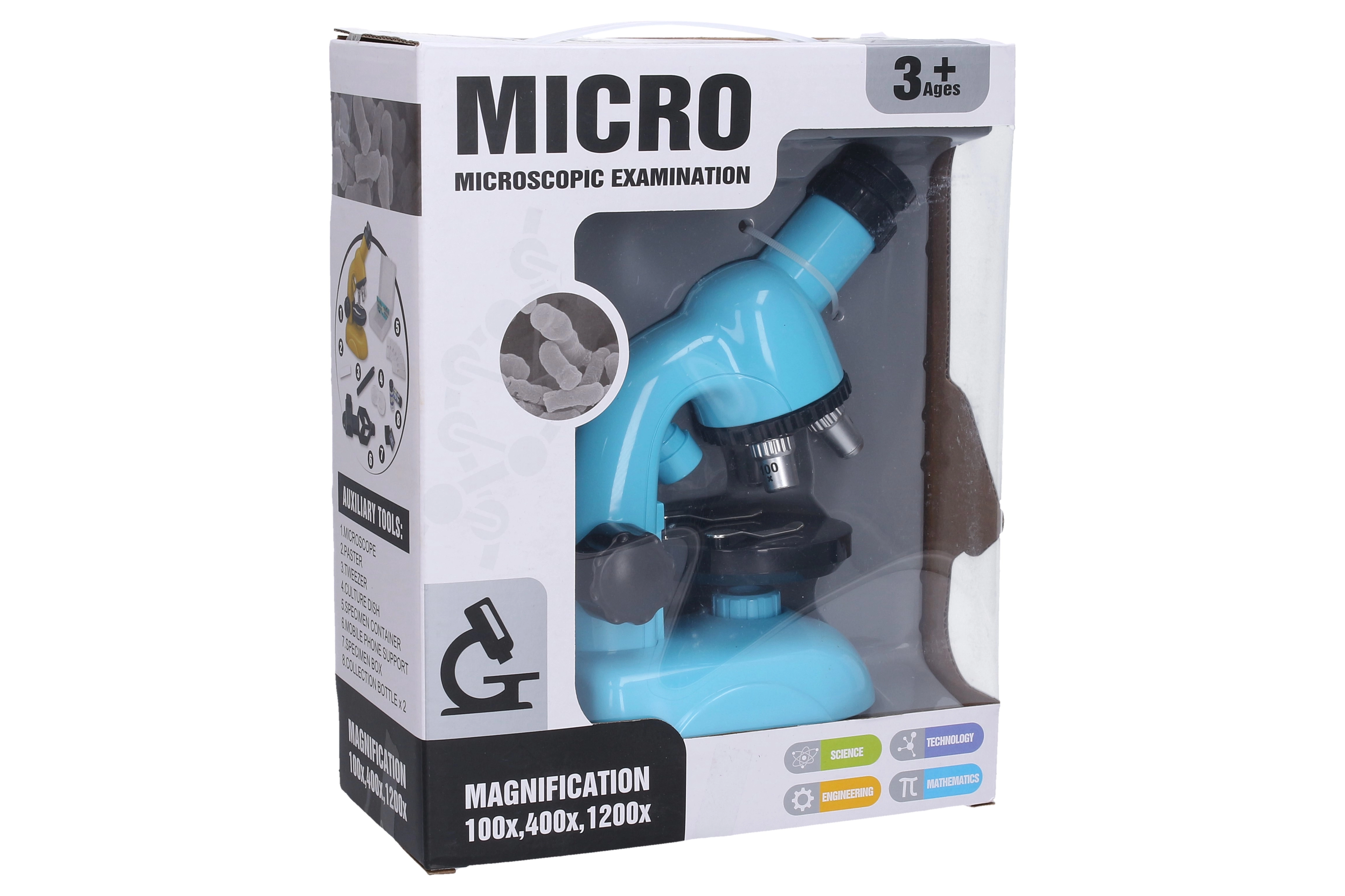 Scopri il mondo della microscopia con questo microscopio compatto da 21 cm, che offre ingrandimenti 10×, 400× e 1200×. La confezione include un supporto per smartphone per fotografare i campioni ingranditi, un set di vetrini e accessori di base per i primi esperimenti. L’alimentazione è fornita da 2× batterie AA (non incluse).