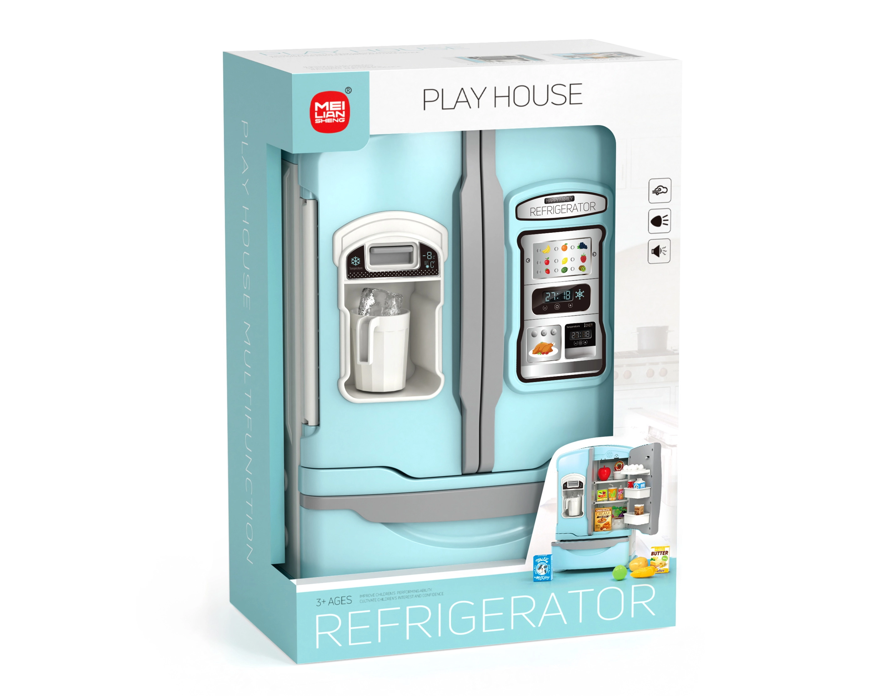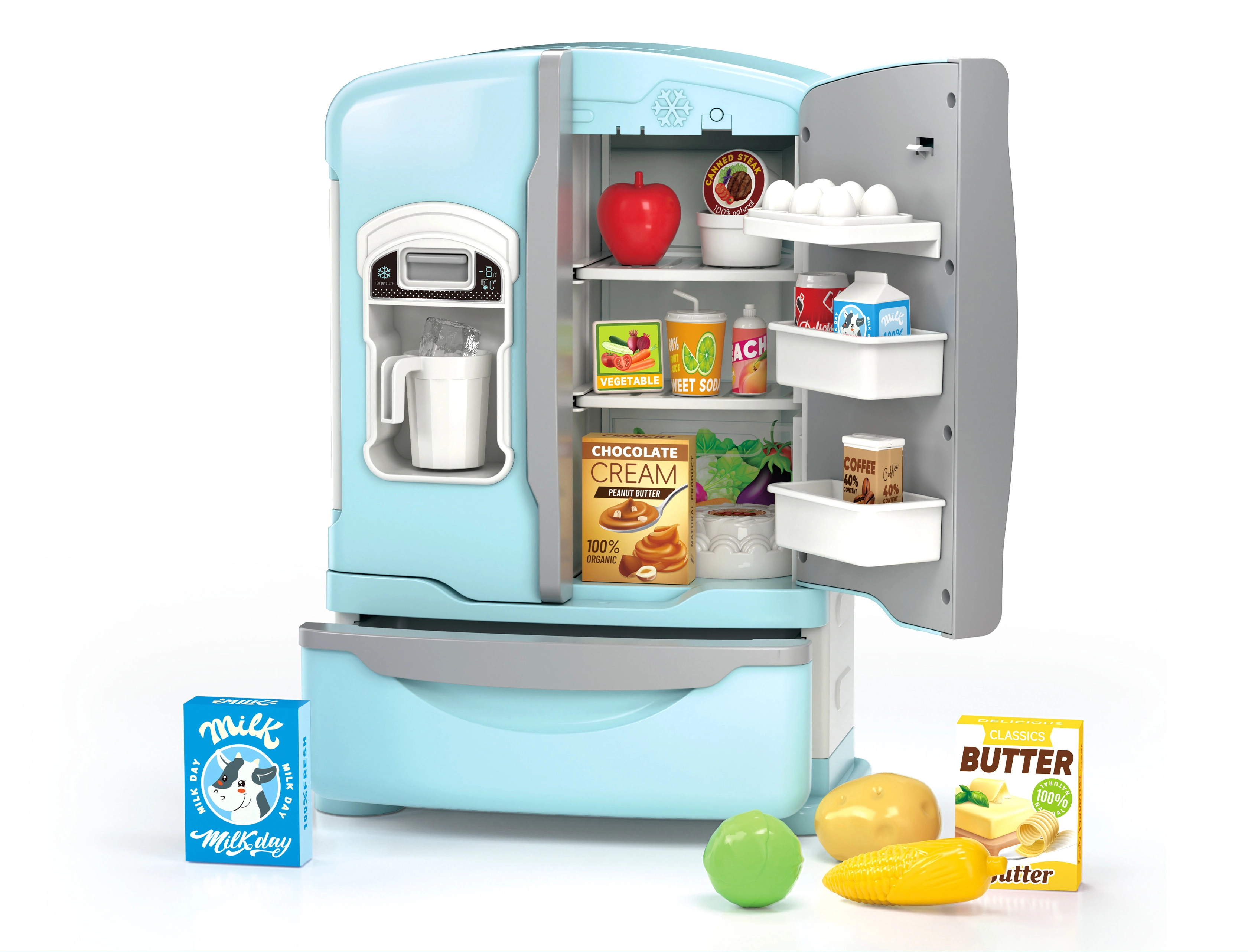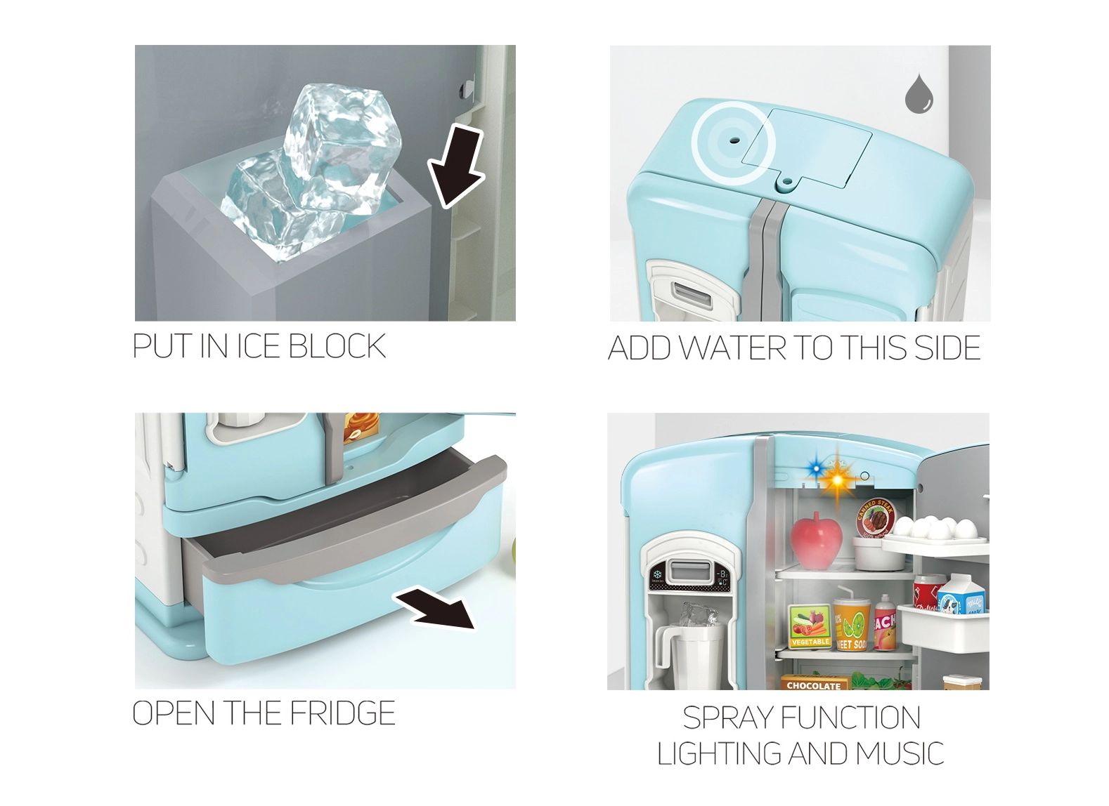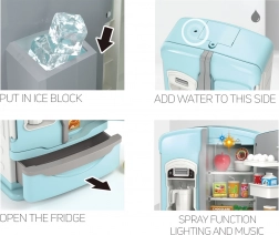 Questo frigorifero giocattolo è un’ottima aggiunta a ogni cucinetta per bambini. Dopo aver versato l’acqua nell’apertura superiore e aperto lo sportello, crea un attraente effetto nebbia che, insieme alla luce LED e agli effetti sonori, stimola la fantasia e il divertimento nel gioco di ruolo domestico.