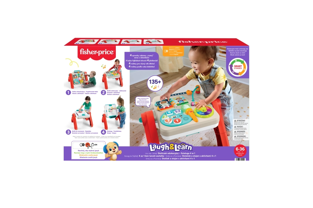 Il tavolino interattivo FISHER-PRICE 4 in 1 porta un apprendimento intelligente attraverso il gioco in ogni fase di sviluppo. I bambini si divertono con la tavolozza “dell’artista” che insegna numeri, colori e forme, la ruota colorata girevole con musica, il libricino girevole, l’asta con perline e lo spinner per sviluppare la motricità fine. Le modalità Smart Stages si adattano facilmente all’età e ai progressi del bambino.