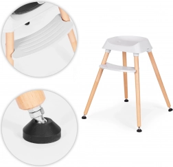 Cinture a 5 punti, elemento tra le gambe e gambe in legno stabili con terminali antiscivolo proteggono il bambino dallo scivolamento e garantiscono la massima stabilità.