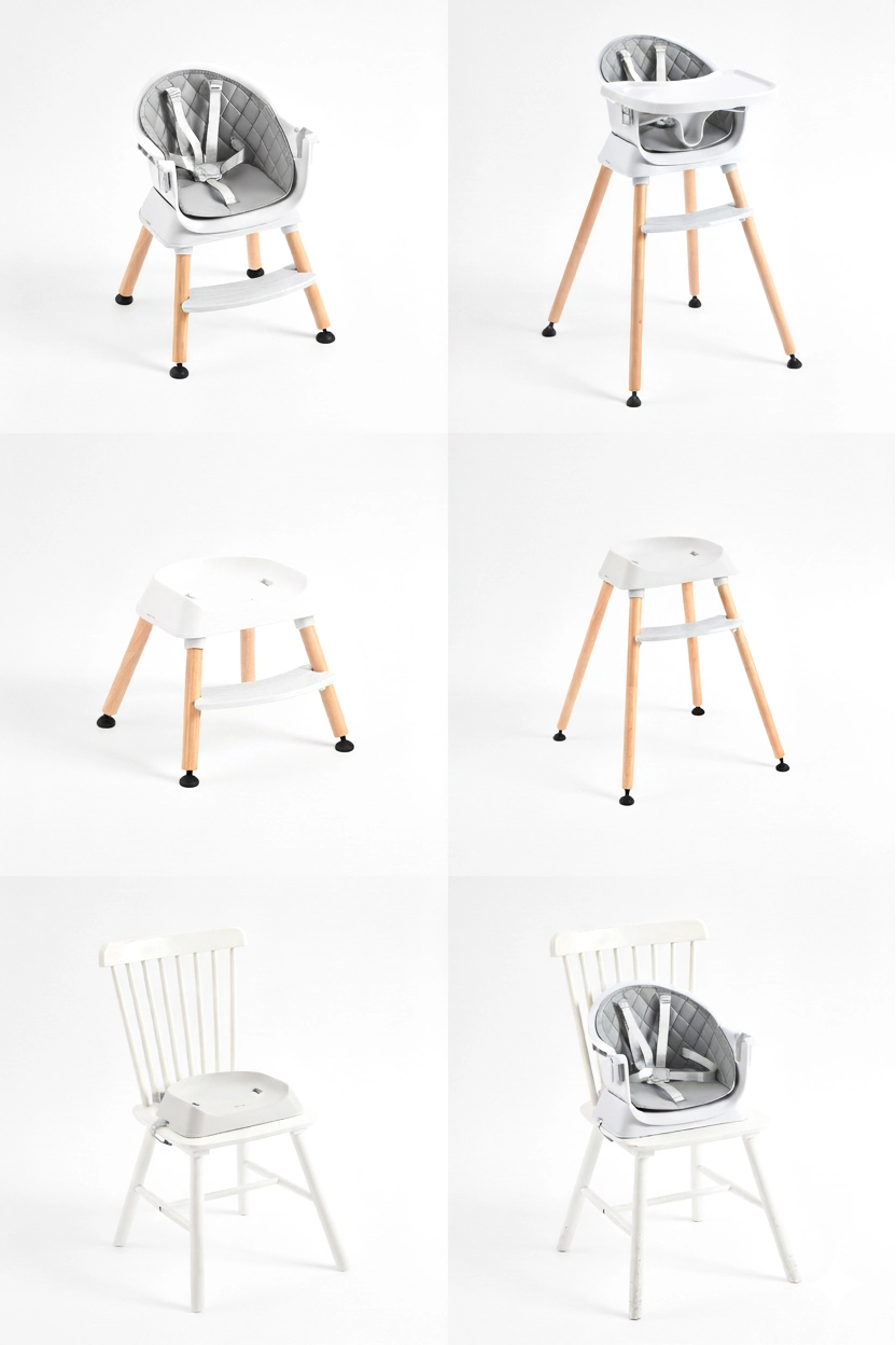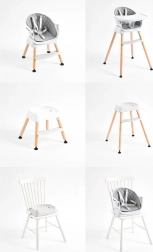 Seggiolone alto, poltroncina bassa, rialzo/booster, seduta senza gambe, sgabello alto e sgabello basso: una soluzione che cresce con il bambino e fa risparmiare spazio e denaro.