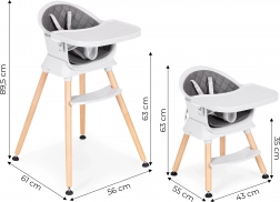 Il vassoio rimovibile con bordo rialzato mantiene l’ordine durante i pasti e può essere lavato in lavastoviglie. Le cinture a 5 punti e l’elemento di sicurezza tra le gambe impediscono al bambino di scivolare, mentre le punte antiscivolo e le robuste gambe in legno conferiscono stabilità anche su pavimenti lisci. Il rivestimento trapuntato in eco-pelle è facile da mantenere: basta passare un panno umido.