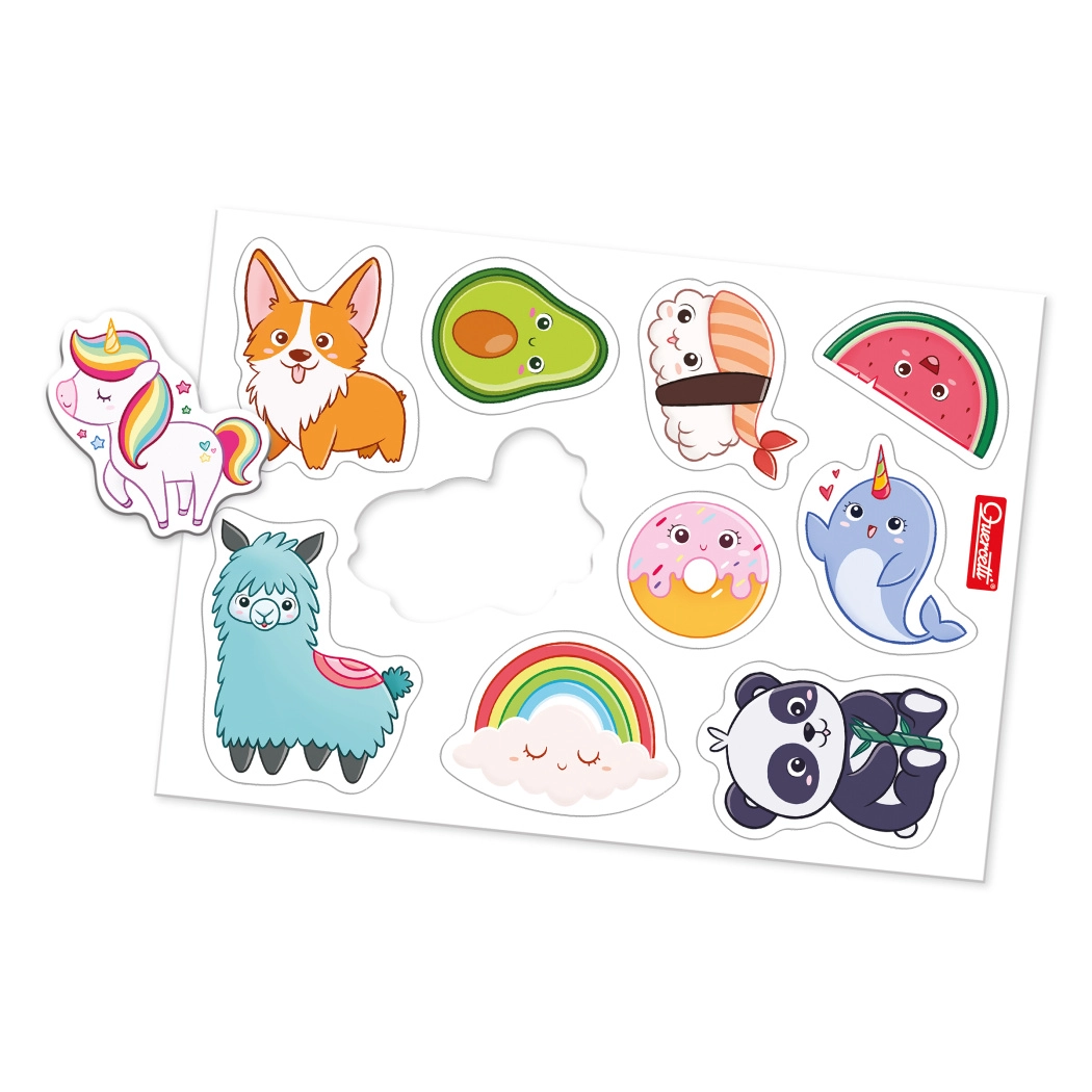 - Lavagna bifacciale (bianca per pennarello a secco, nera magnetica), 48 lettere magnetiche, 10 magneti illustrati, 1 pennarello cancellabile a secco, 1 spugnetta, 2 supporti