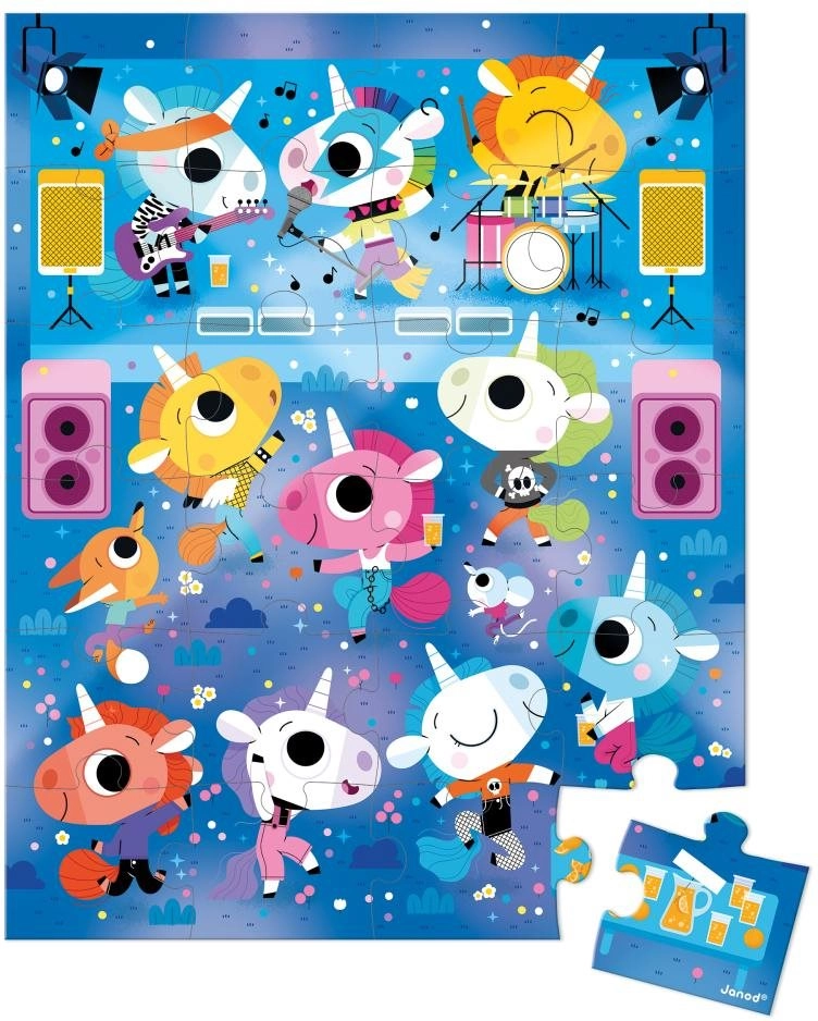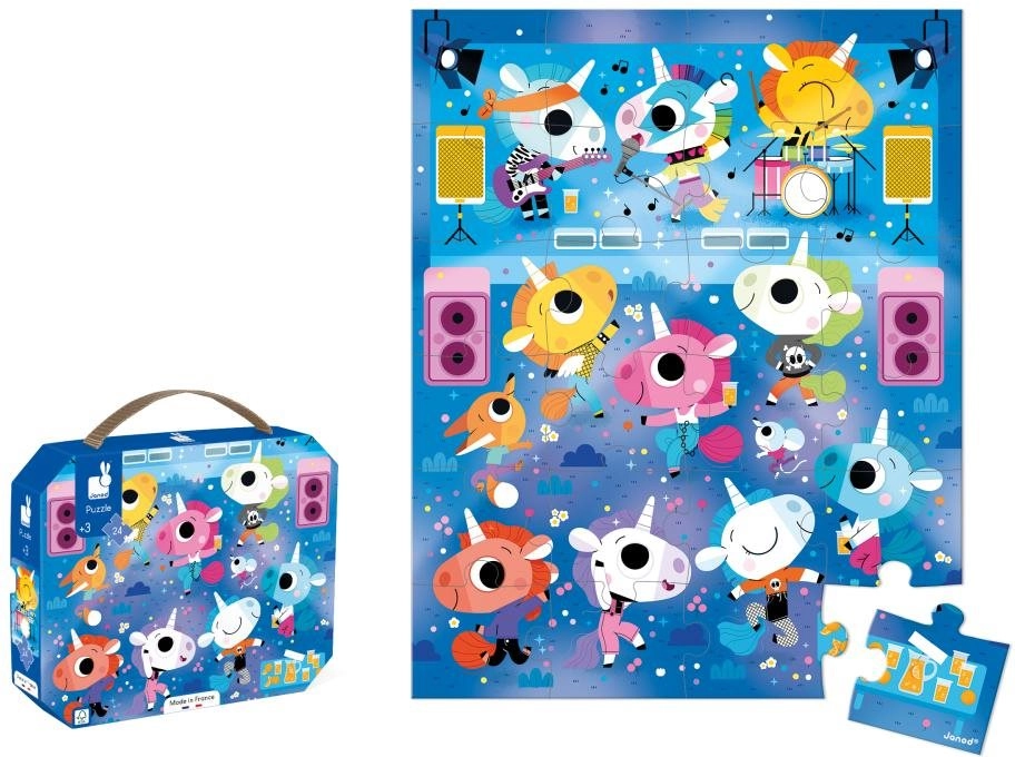 Scopri il grazioso puzzle in valigetta del marchio Janod con il tema del concerto degli unicorni. Grazie ai 24 pezzi robusti i bambini comporranno facilmente una grande immagine di circa 50 × 40 cm. La pratica valigetta in cartone con manico è ideale a casa e in viaggio e mantiene tutti i pezzi insieme.