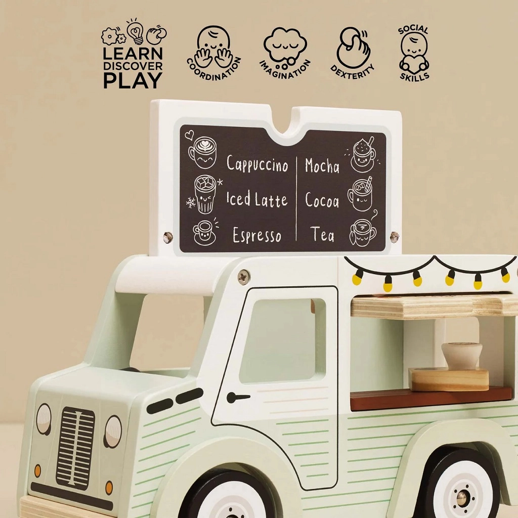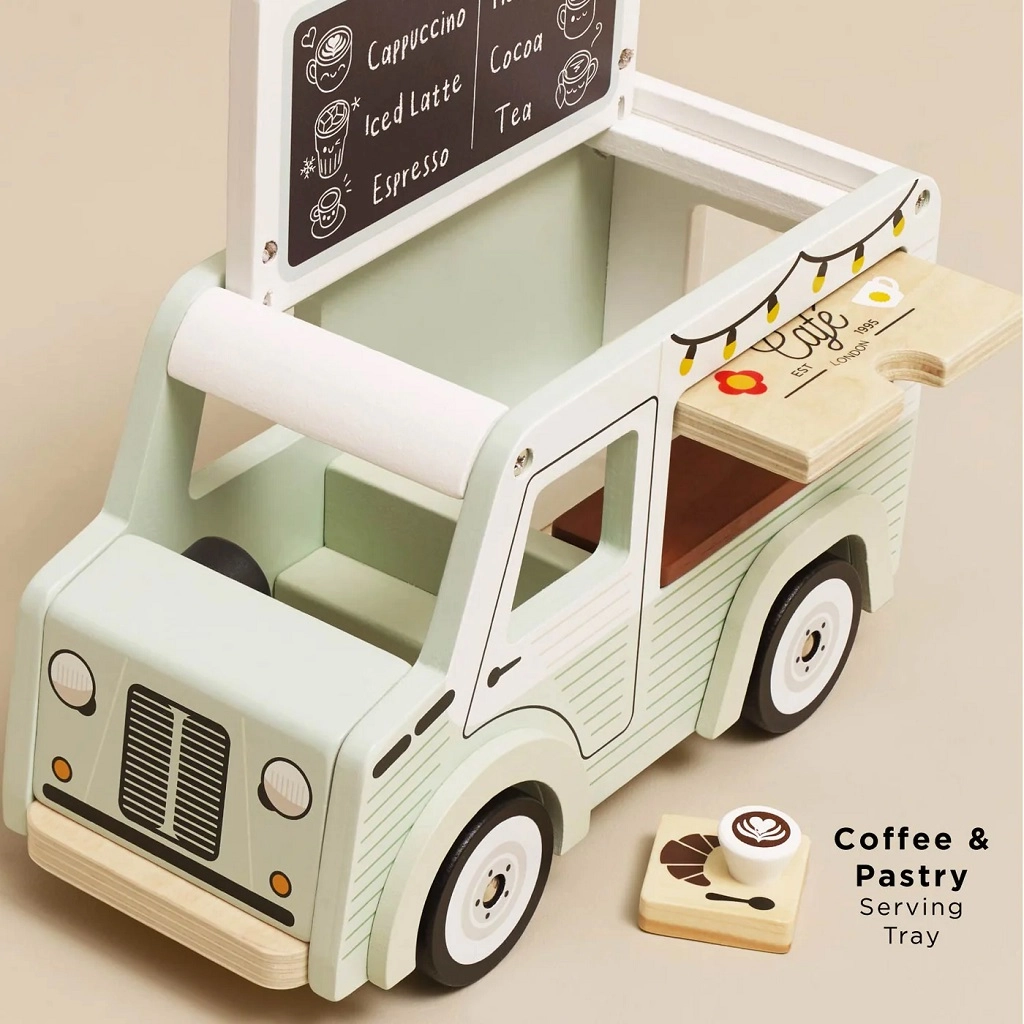 Scoprite il fascino di una caffetteria su ruote in versione per bambini. La caffetteria mobile Le Toy Van Street Coffee si distingue per il delicato verde pistacchio e il bianco, le illustrazioni dettagliate e le funzioni studiate che catturano i bambini nel mondo dell’immaginazione. Il tettuccio si apre facilmente e all’interno troverete il menu con l’offerta di caffè e tè; la finestra di servizio anteriore permette di servire i “clienti” proprio come in una vera caffetteria.