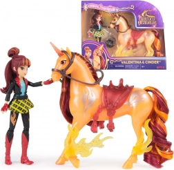 Scopri la magia dell'amicizia con il set di figurine UNICORN ACADEMY Valentina e Cinder. La bambola alta 11,5 cm ha 7 articolazioni per pose dinamiche, l'unicorno Cinder (12,5 cm) vanta dettagli realistici, simboli metallici di magia del fuoco e accessori magici. Grazie a briglie e sella rimovibili Valentina rimane salda in sella durante la corsa e la criniera può essere pettinata con il pettine incluso.