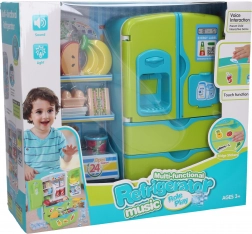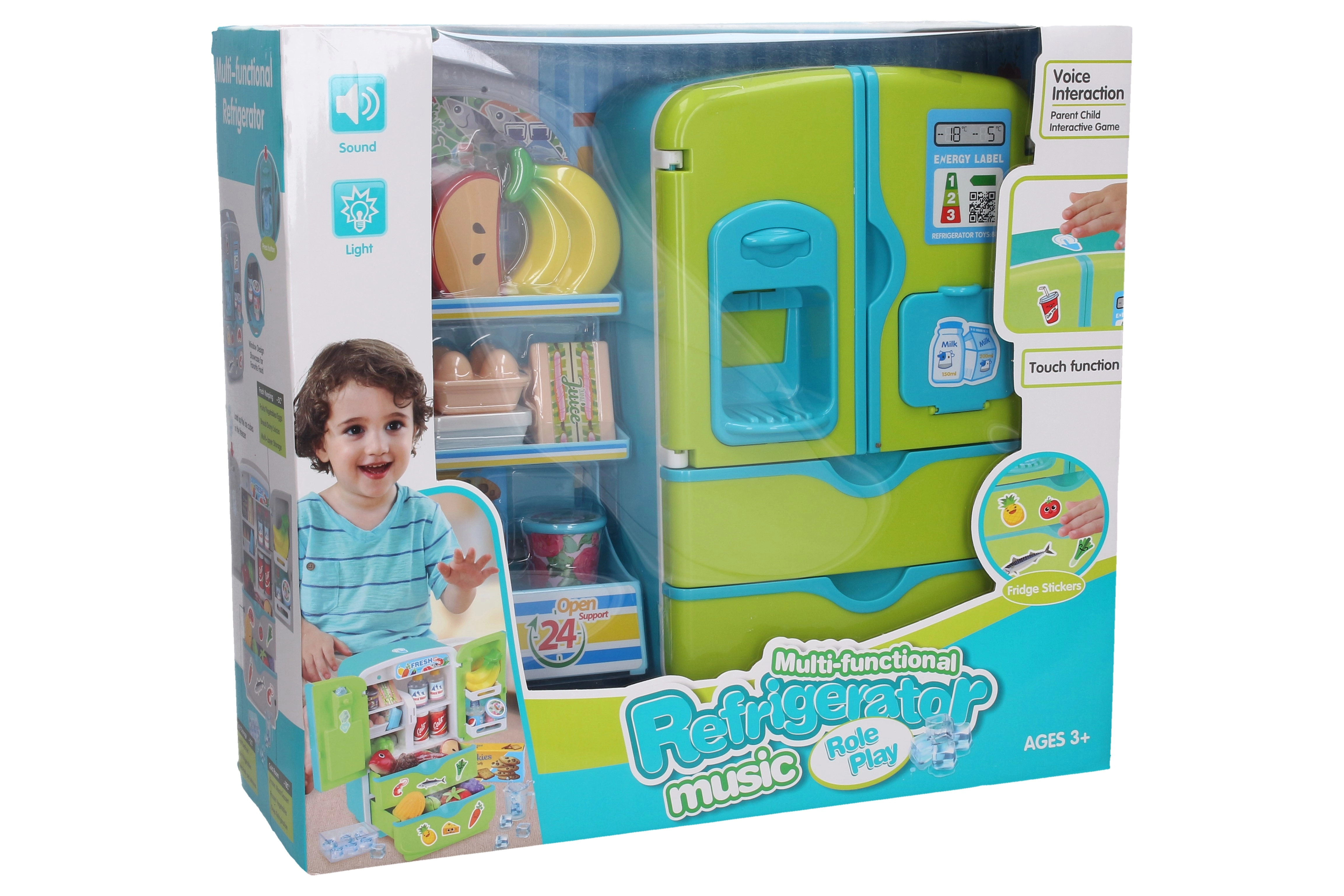 Divertente frigorifero giocattolo per bambini con scaffale e alimenti, alto 28 cm, porta un gioco realistico in ogni cameretta. Offre effetti luminosi e sonori che stimolano la fantasia e comandi touch per un'interazione semplice. Ideale per piccoli cuochi e negozianti.