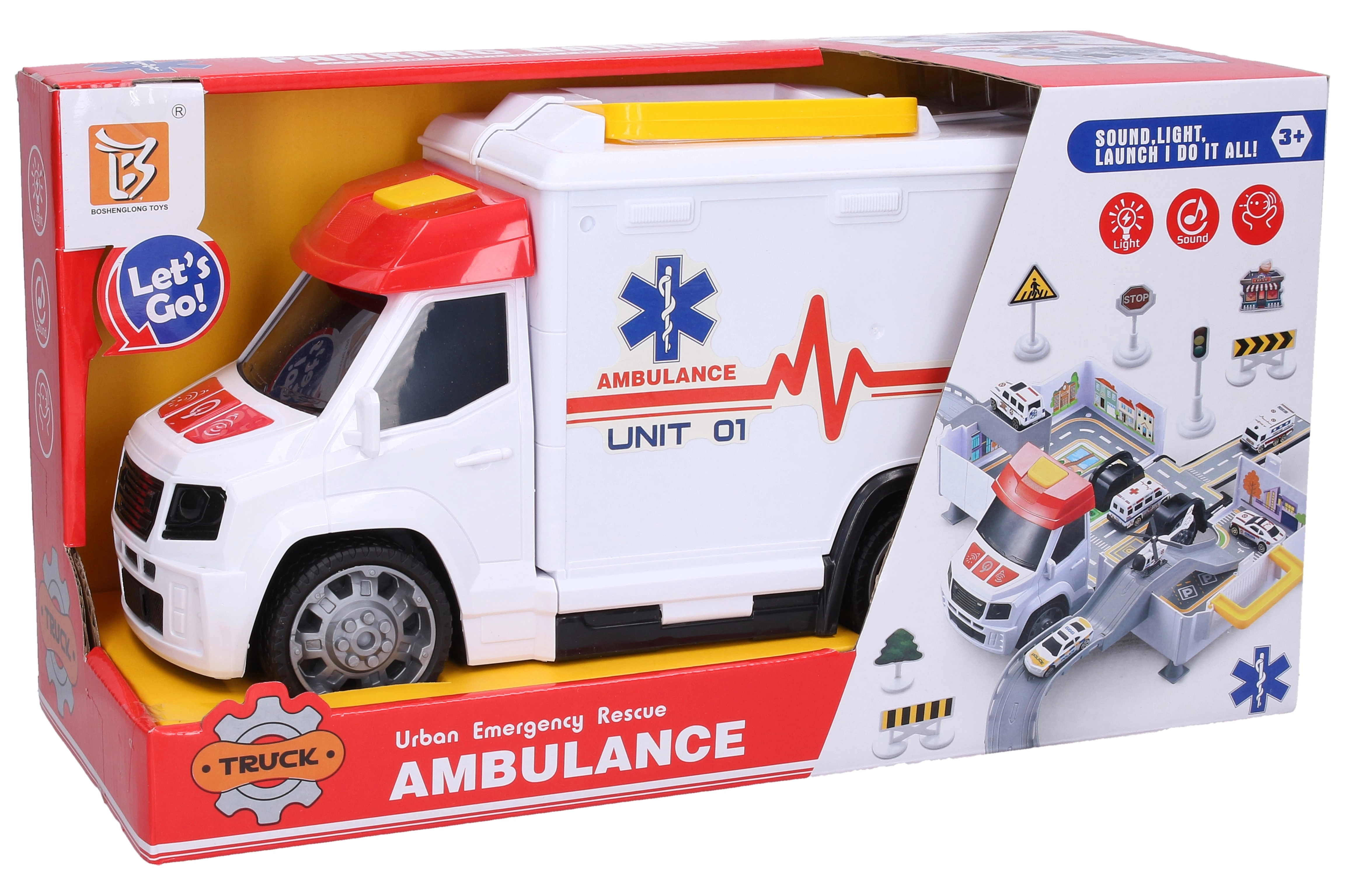 Divertente e realistica ambulanza con garage ospedaliero pieghevole che offre ai bambini ore di gioco. Dispone di effetti luminosi e sonori, attivazione tramite pulsanti sul cofano e grande pulsante sul tetto per lo sblocco. Alimentazione inclusa 3× AG13. Le ruote libere garantiscono una guida fluida e, una volta aperta, si trasforma in un area di gioco dell'ospedale con macchinine e segnali.