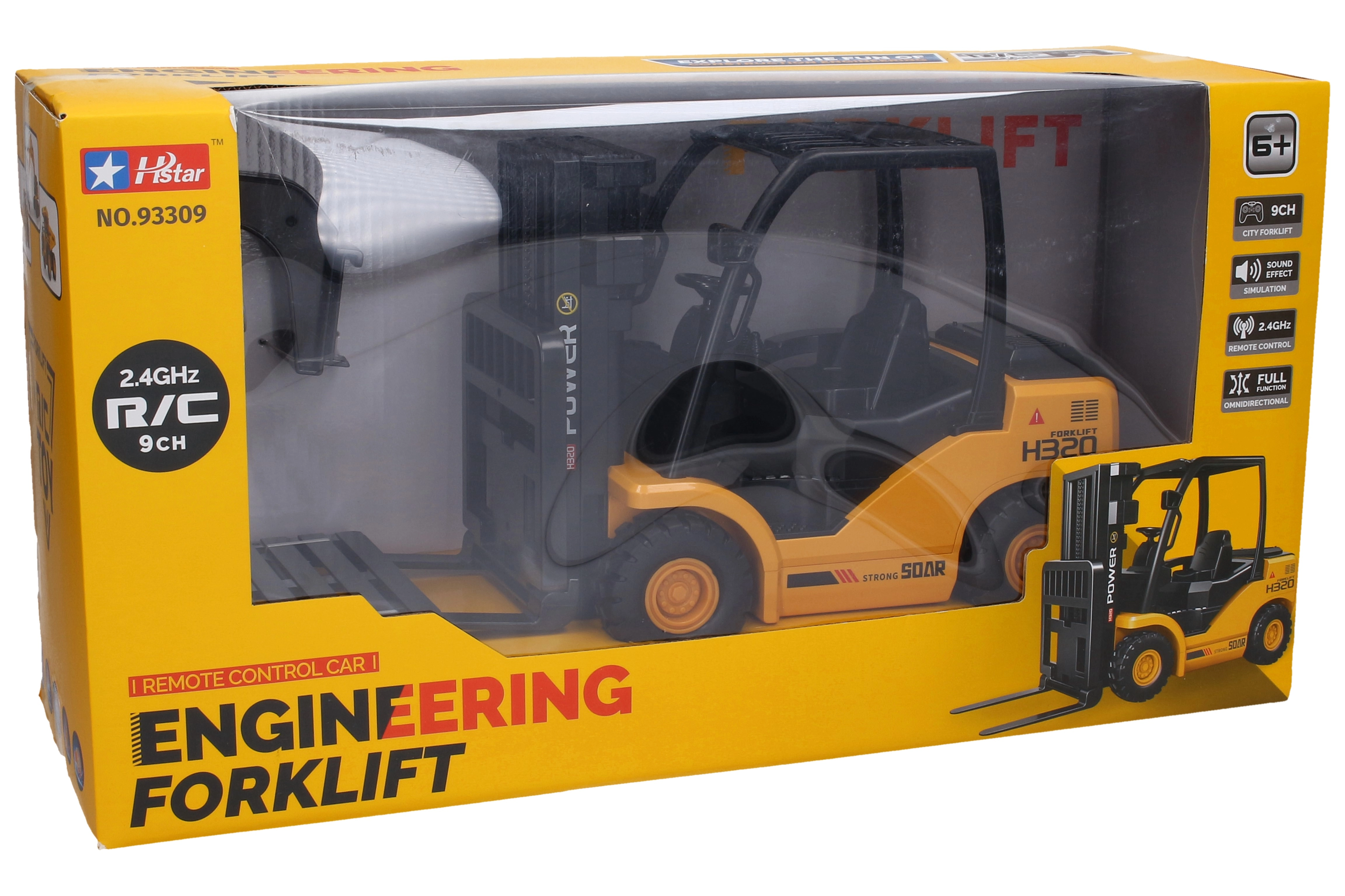 Il modello è dotato di effetti sonori con possibilità di disattivarli, un chiaro interruttore ON/OFF e una pratica modalità DEMO. Nella confezione trovi un pallet e un adattatore con gancio per spostare facilmente il carico. Il pacco batteria da 3,7 V per il modello è incluso; basta aggiungere 2× batterie AA al radiocomando.