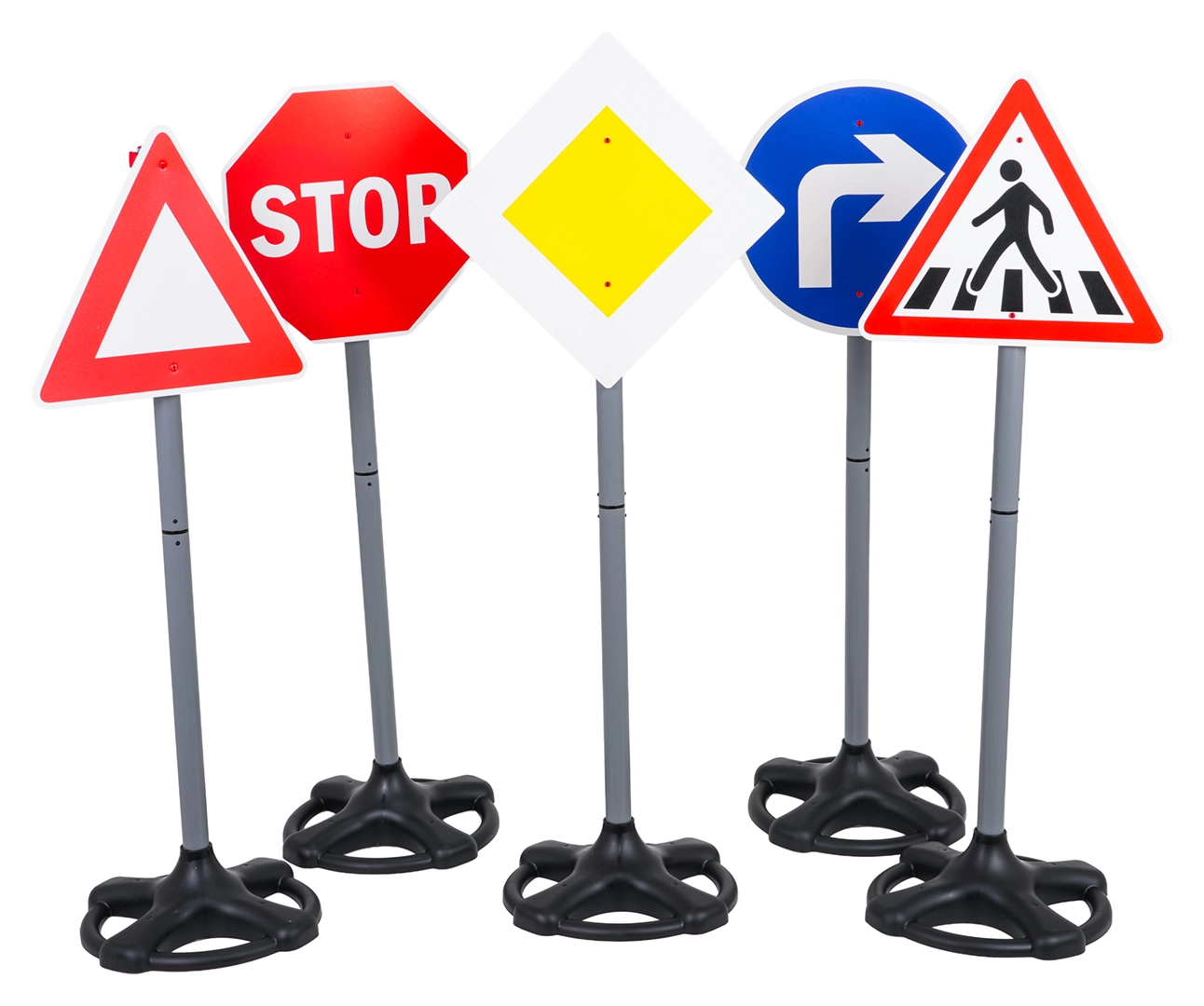 - Contenuto del set: STOP, Triangolo di pericolo, Attraversamento pedonale, Strada con diritto di precedenza, Direzione obbligatoria a destra