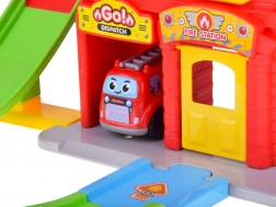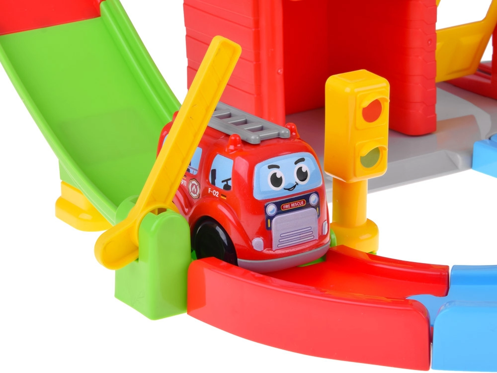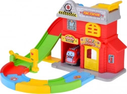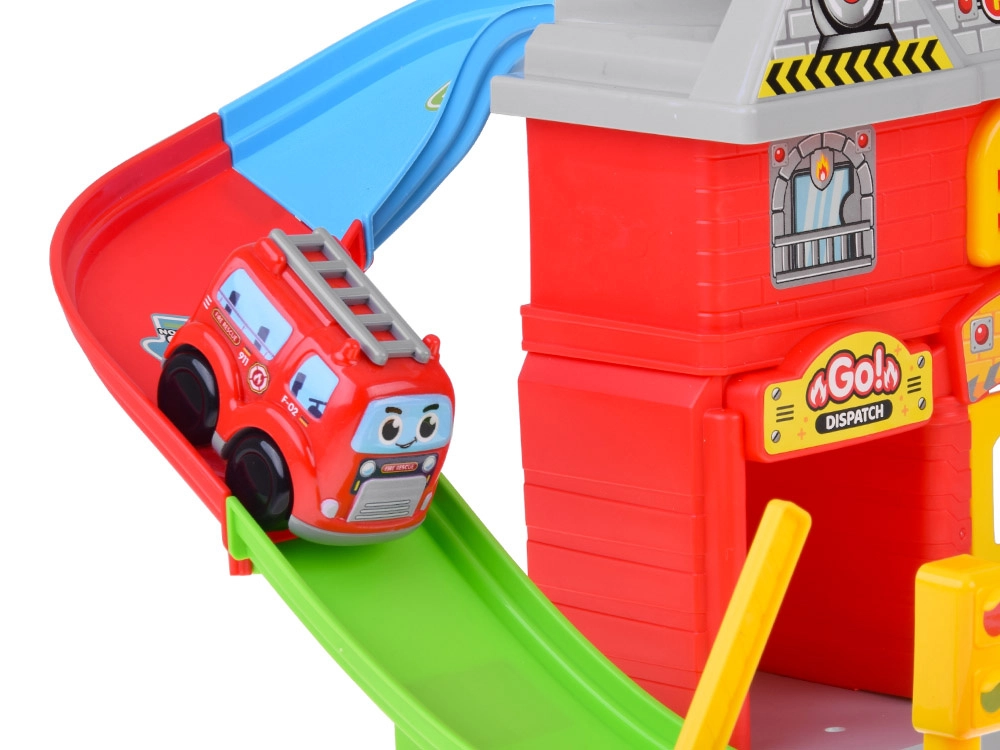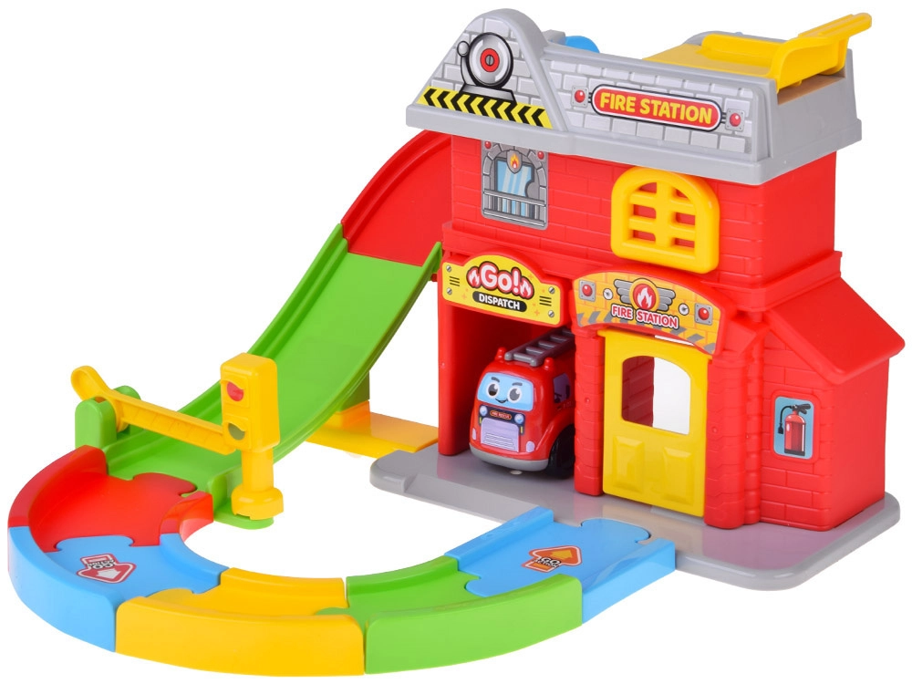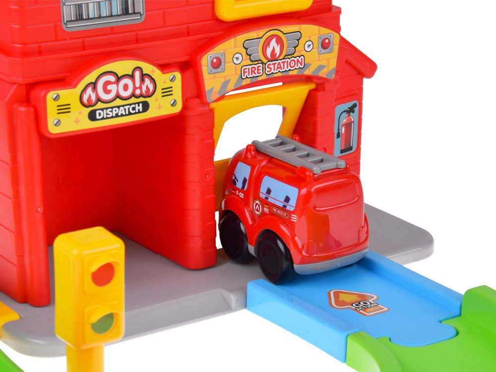 - Stazione dei pompieri con porte apribili e pista a spirale, camioncino dei pompieri, sbarra e semaforo