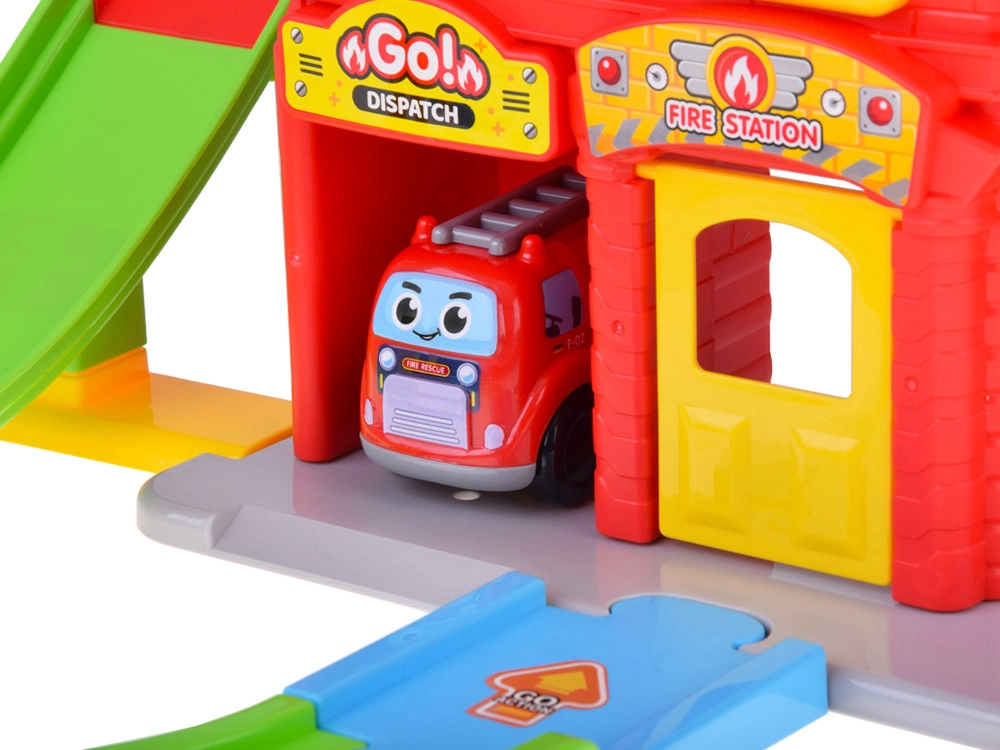 Colorata stazione dei pompieri con discesa tortuosa/a spirale e camioncino dei pompieri che offre ai bambini ore di divertimento e sviluppo delle abilità. Le porte apribili, il meccanismo di rilascio sul tetto, la sbarra e il semaforo stimolano fantasia, motricità fine e la comprensione del rapporto causa–effetto.