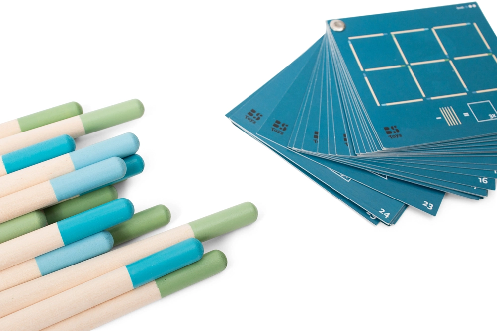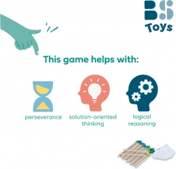 Contenuto della confezione: 24 bastoncini in legno con estremità colorate (21 × 0,9 cm), 30 carte con compiti e un sacchetto in tessuto per riporre facilmente. Il gioco supporta perseveranza, pensiero orientato alla soluzione e ragionamento logico.