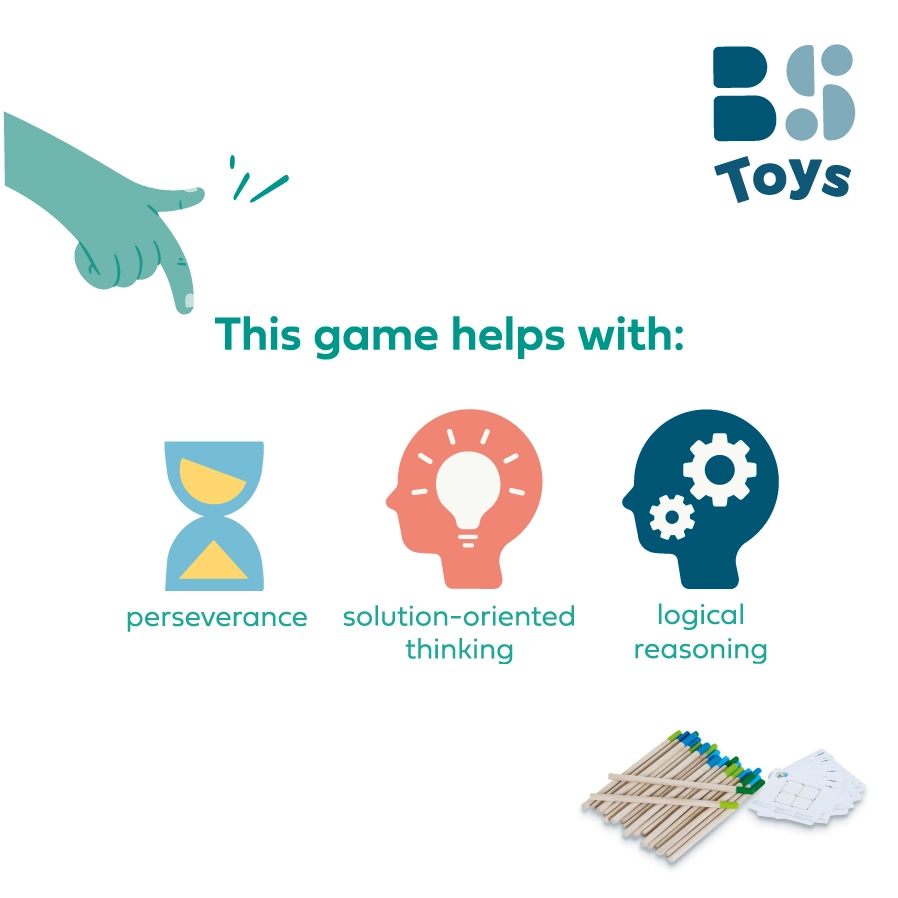 Questo gioco logico con bastoncini di legno offre un divertimento intelligente che allena la pazienza per tutta la famiglia. Scegli un compito dalla carta, componi la forma richiesta con i bastoncini e verifica la soluzione sul retro della carta. Grazie alla difficoltà progressiva, tornerai volentieri alle sfide più e più volte.