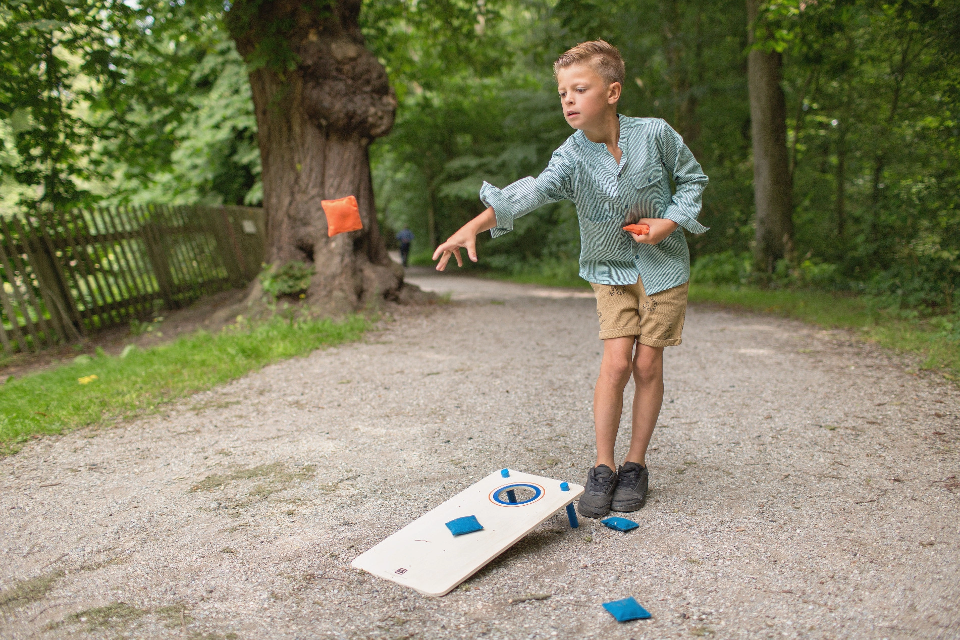 Le tavole hanno gambe rimovibili per un montaggio rapido e un trasporto agevole. Il set include 2 tavole in legno e 8 sacchetti colorati (4 blu e 4 arancioni), così puoi iniziare a giocare subito. Il legno proviene da fonti gestite in modo responsabile, per divertirti nel rispetto della natura.