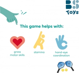 Nella confezione trovi l’attrezzatura completa per 2 giocatori: 2 racchette in legno (40 × 19 cm), 2 palline, rete portatile e borsa per una sistemazione e un trasporto semplici. Le regole si imparano in un attimo e si può giocare anche su campi più piccoli – per esempio nel cortile della scuola o in palestra.