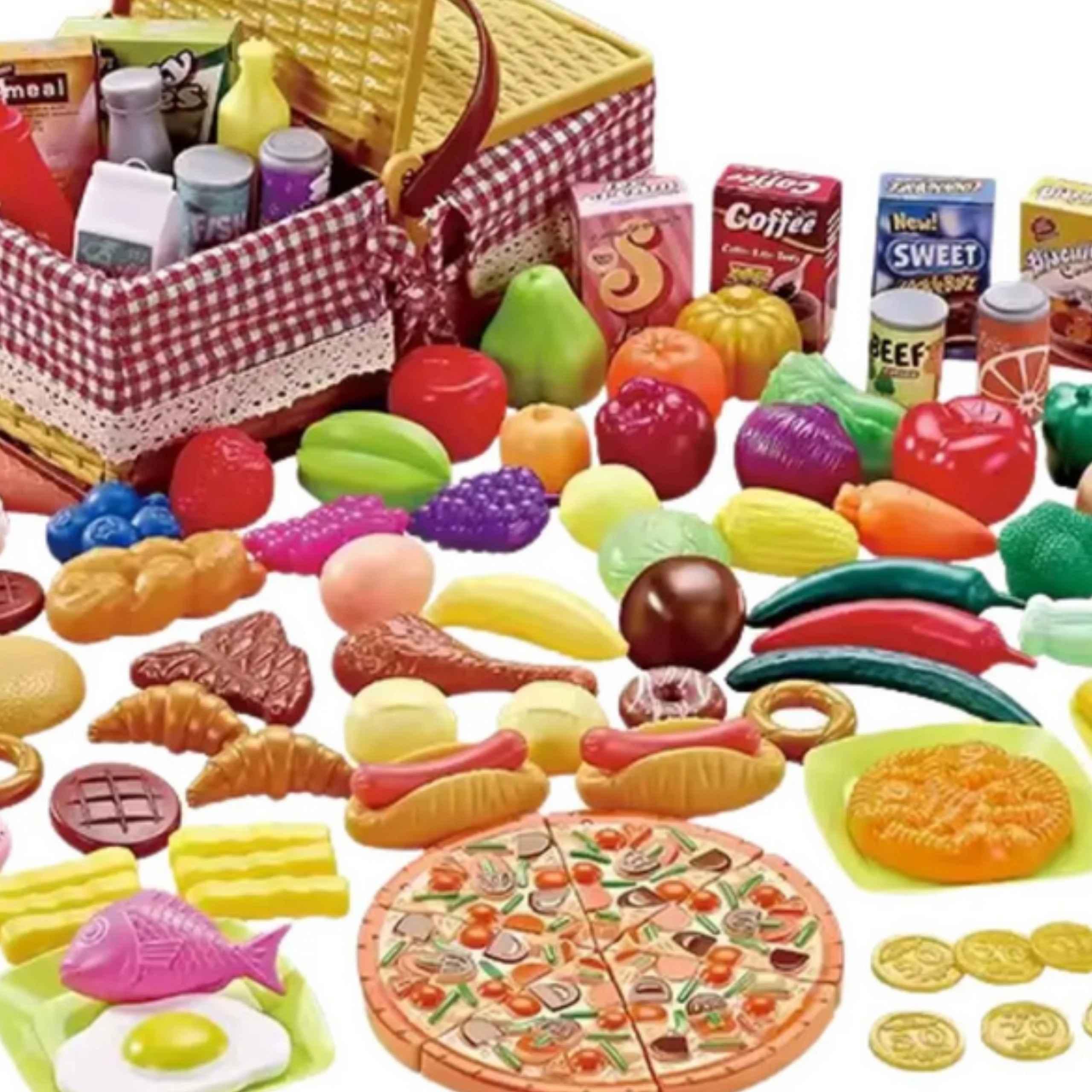 Nella confezione trovi una vasta selezione di alimenti e accessori: dalla pizza tagliata a spicchi a frutta e verdura, fino a dessert, bevande e posate. Non mancano banconote e monete per il gioco del negozio, che sviluppa pensiero logico e calcolo.