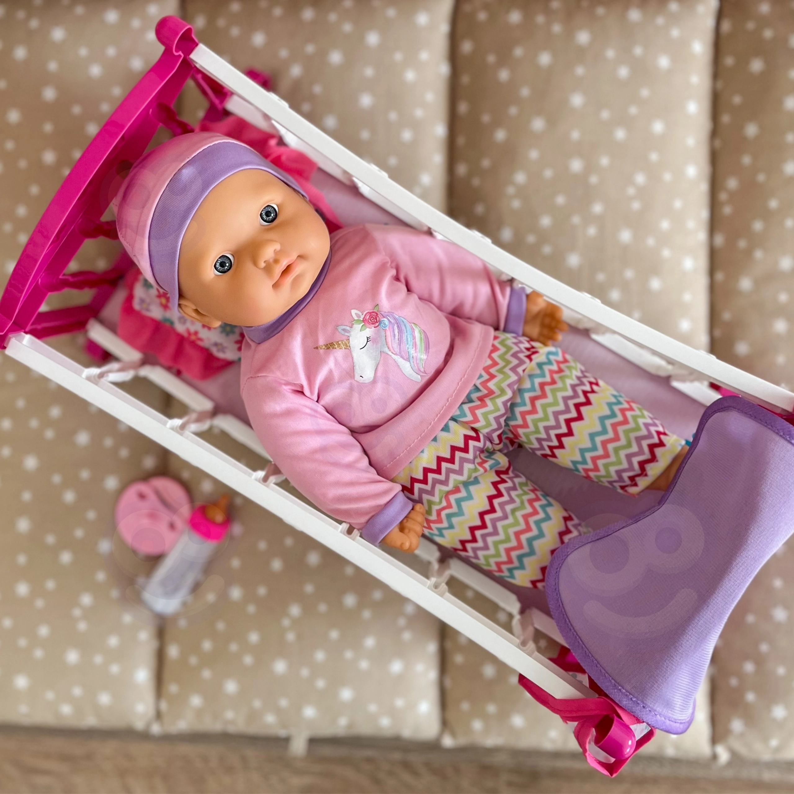 La culla rosa e bianca con sponde traforate e pattini curvi dondola dolcemente e aiuta a “cullare” la bambola per farla addormentare. Leggera, stabile e facile da trasportare.