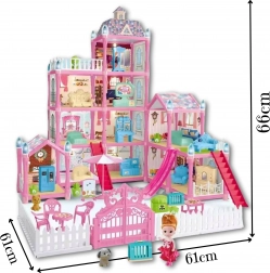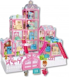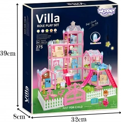 • Ricco set da 275 pezzi: casa da assemblare, bambolina, cagnolino, giardino con recinzione e cancello, tavolo e sedie, divano, letto, armadio, frigorifero, scale, scivolo e altro.