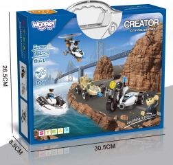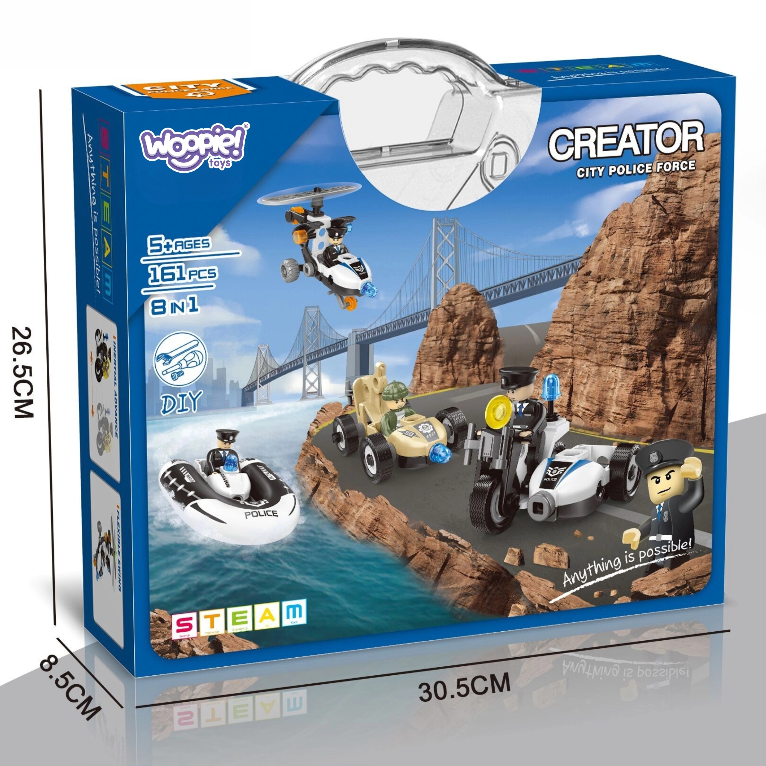 Scopri il mondo delle missioni di polizia con il set Woopie Creator City Police Force. I bambini possono assemblare autonomamente vari modelli di veicoli imparando i principi STEAM – una combinazione di creatività, logica e pensiero tecnico. Sono incluse anche mini-figure di agenti di polizia per un gioco e delle scenette cittadine ancora più realistici.