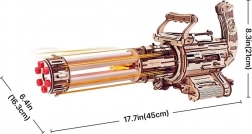 Il modello è composto da 412 pezzi in legno tagliati con precisione e si assembla senza l’uso di colla. Il grilletto anteriore aziona la rotazione delle canne, quello superiore attiva il tiro: doppia azione per il doppio del divertimento. Una volta completato, otterrai un elemento decorativo di grande impatto, perfetto per qualsiasi collezione di repliche tecniche e cinematografiche.