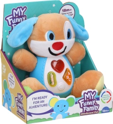 Il dolce cagnolino interattivo è un giocattolo ideale per i più piccoli. Offre effetti luminosi, effetti sonori e melodie, che si attivano tramite i pulsanti sul pancino. Grazie all'interruttore ON/OFF sul lato, il giocattolo può essere spento facilmente. La combinazione di morbido peluche e pancino in plastica favorisce la stimolazione sensoriale e un gioco sicuro.