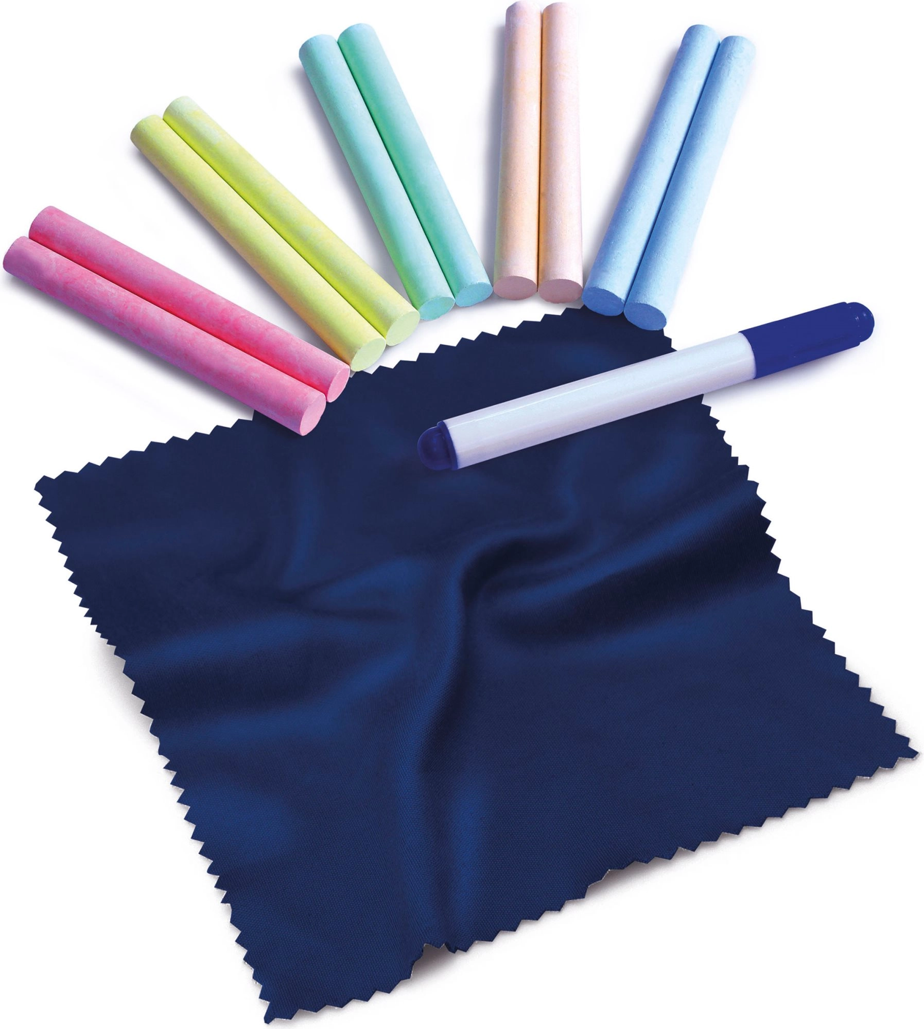 - Scatolina con 10 gessetti, 1 pennarello nero cancellabile, panno per cancellare