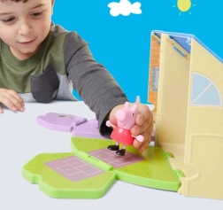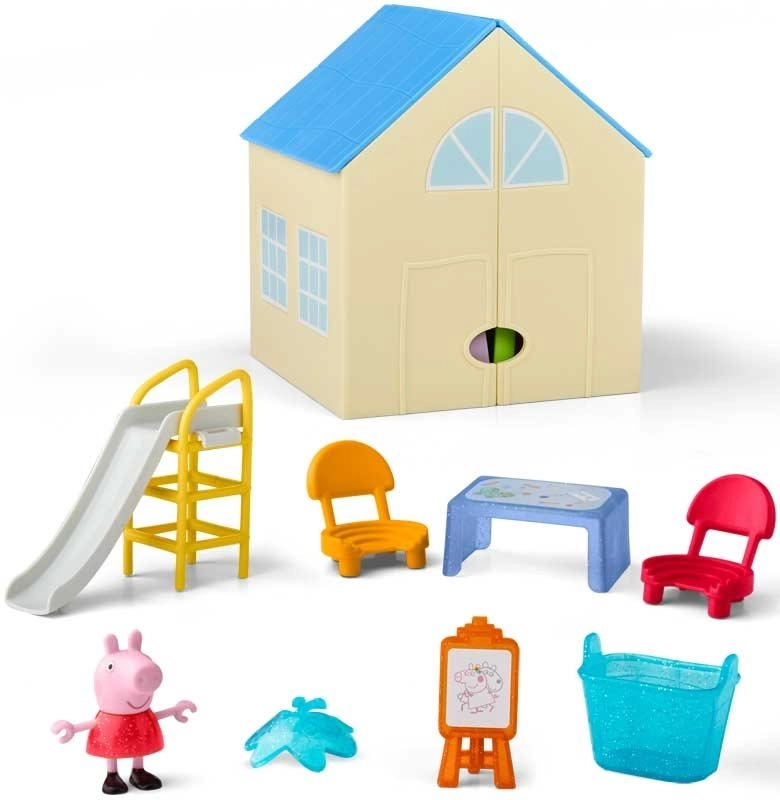 Include una personaggina snodabile di Peppa alta 7,5 cm, che può sedersi sulle sedioline, indossare la maschera e scivolare sullo scivolo. Grazie alla pratica chiusura, dopo il gioco tutti i pezzi si ripongono all’interno, così non si perde nulla.