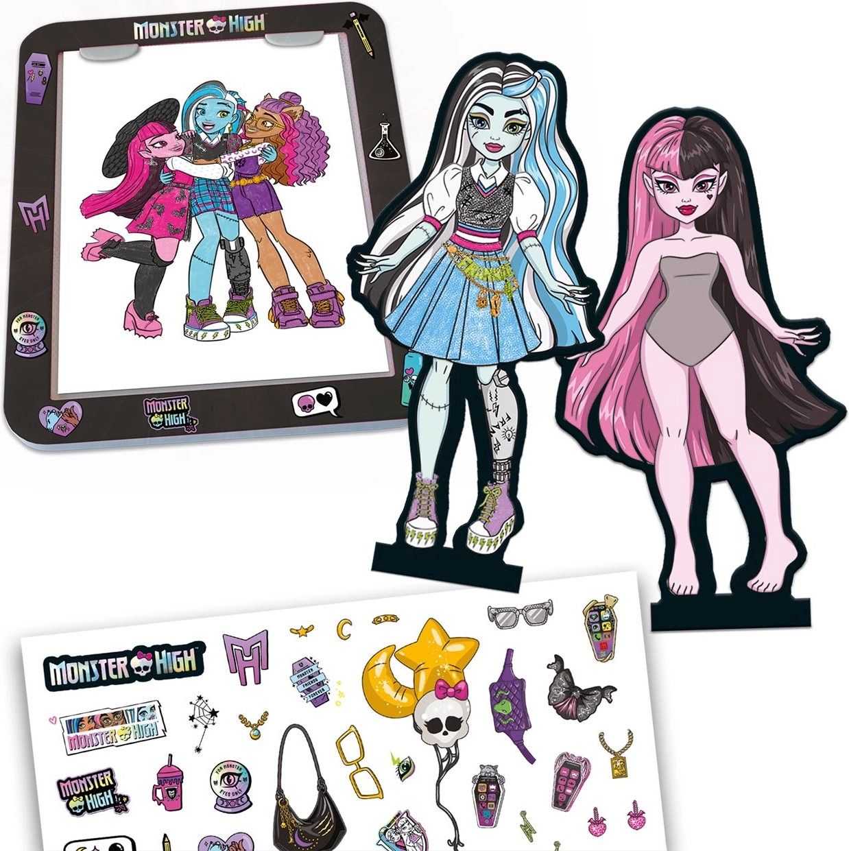 - 4 figurine MONSTER HIGH, 1 base luminosa (tavoletta), 4 supporti per figurine, 1 matita, 1 foglio di adesivi, opuscolo di 32 pagine con contenuti per il ricalco, 1 scenografia, istruzioni