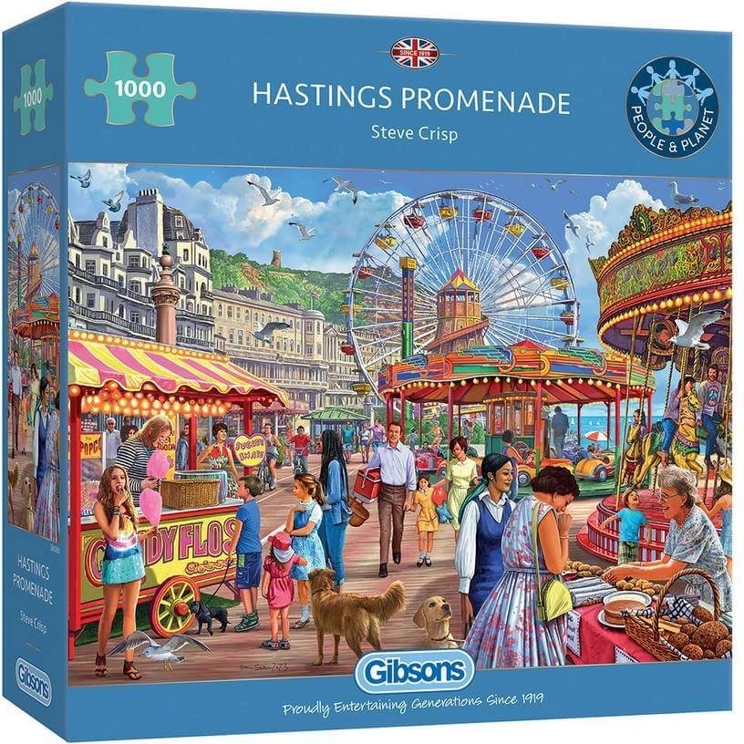 Scopri il fascino della cittadina balneare britannica con il puzzle Gibsons Promenade a Hastings. I pezzi finemente ritagliati combaciano alla perfezione, rendendo l’assemblaggio fluido e piacevole. L’illustrazione è ricca di dettagli – dalle bancarelle sul molo ai visitatori che passeggiano – per ore di divertimento assicurate.