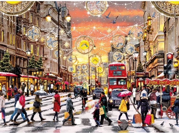Goditi un tranquillo pomeriggio invernale con un puzzle di qualità del marchio GIBSONS. L’immagine “Trambusto festivo” con 1000 pezzi offre una scena natalizia dettagliata e, una volta completata, misura circa 68 × 49 cm – un formato ideale da incorniciare e per decorare gli interni.