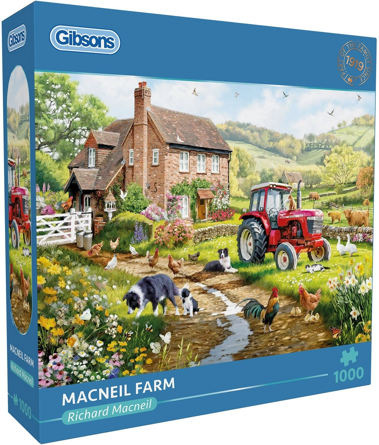 Goditi relax e divertimento con un puzzle di qualità del marchio GIBSONS. L’illustrazione “Fattoria di Macneil” offre 1000 pezzi ricchi di dettagli e colori, perfetti per gli amanti dei motivi rurali. Una volta completato, il puzzle misura circa 68 × 49 cm, ideale da incorniciare o esporre.