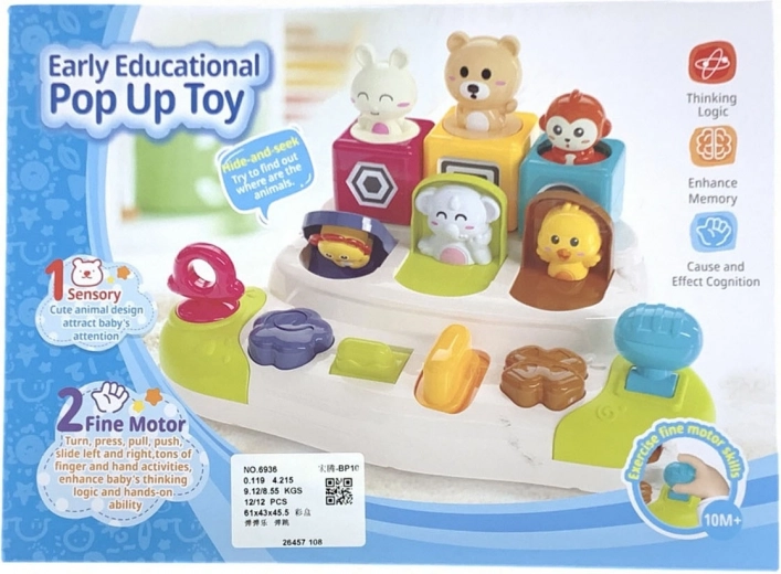 Scopri divertimento e apprendimento in uno con questo giocattolo interattivo con animaletti a comparsa per bambini dai 10 mesi. Plastica di qualità senza spigoli vivi, colori vivaci e simpatici personaggi (coniglietto, orsetto, scimmietta, leone, elefante, paperella) che sviluppano la motricità fine, le capacità cognitive e il principio causa–effetto. Il bambino tira, preme, sposta e ruota i comandi per aprire le finestrelle e far saltare fuori gli animaletti.