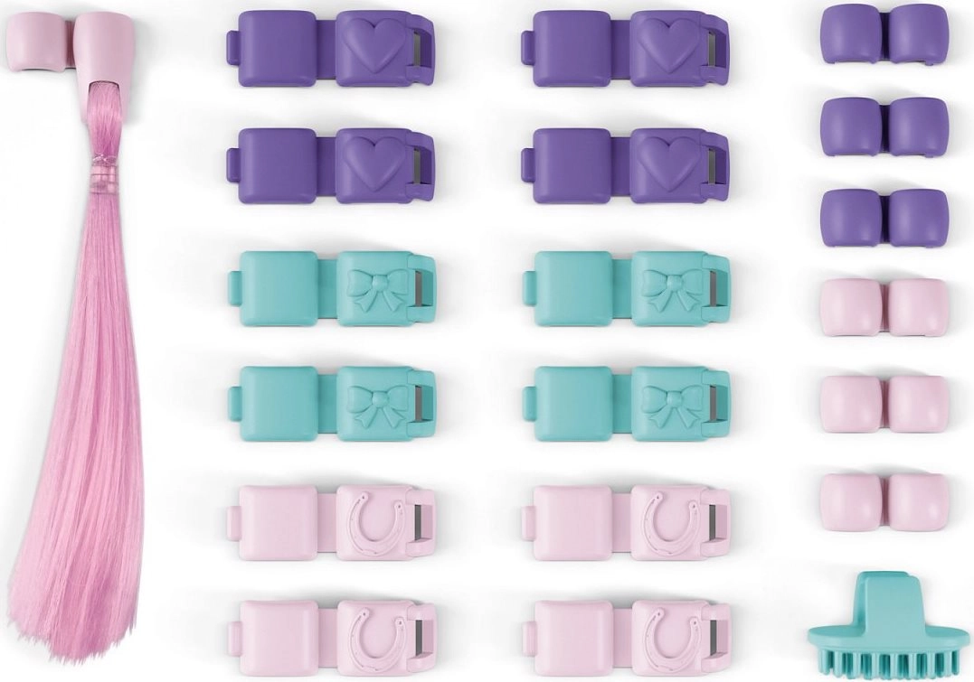 Crea acconciature splendide per i tuoi cavalli con il set di accessori SCHLEICH HORSE CLUB. Le tonalità pastello – menta, lavanda e rosa chiaro – si adattano a fattrici e stalloni di tutte le razze. Prima di applicare gli accessori, basta pettinare accuratamente la criniera con la spazzola, così le mollettine terranno anche nei salti più scatenati. La frangia rosa dona all’acconciatura un effetto “wow” finale.