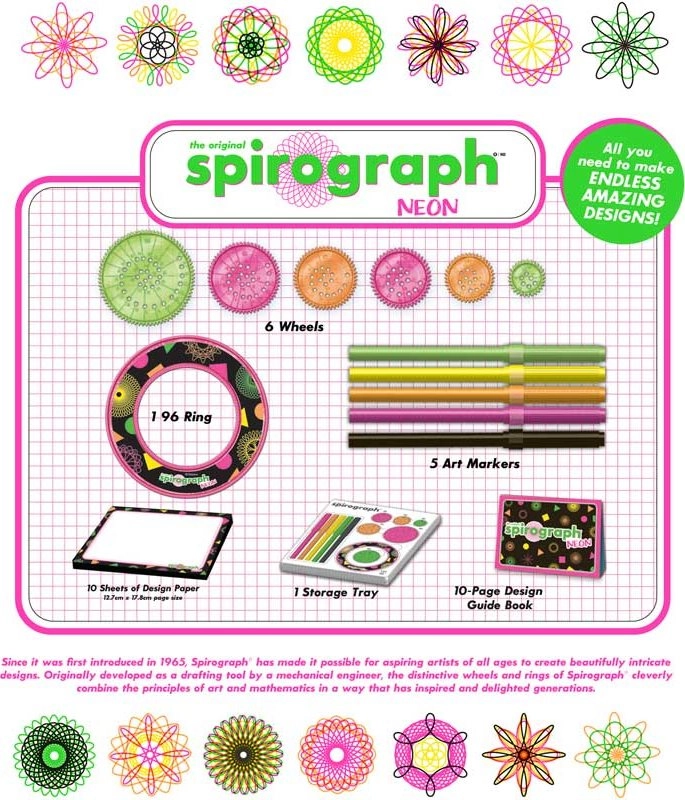 Con lo Spirografo Neon i bambini possono realizzare con facilità motivi geometrici precisi, spirali e mandala, che possono poi colorare. Il set è progettato per sviluppare in modo divertente creatività, capacità di combinazione e motricità fine.