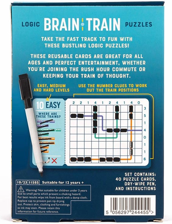 Scopri avvincenti esercizi logici che mettono alla prova la mente e intrattengono allo stesso tempo. Il gioco Brain Train è progettato per migliorare il pensiero logico, la concentrazione e la creatività – in un formato compatto che puoi portare in borsa, nello zaino o in tasca.