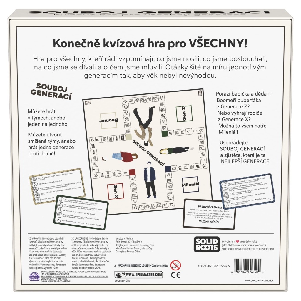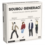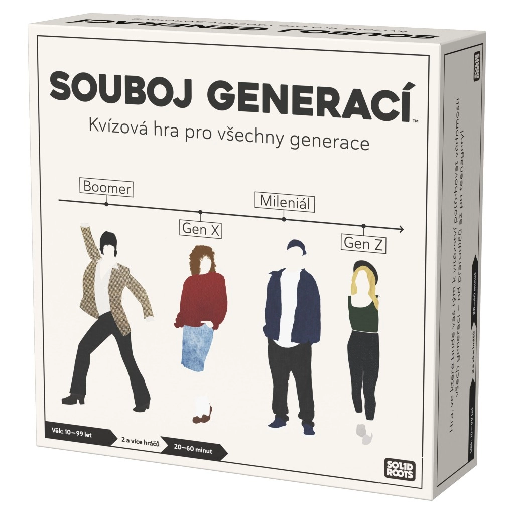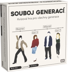Vivi un avvincente duello di conoscenze attraverso il tempo! Questo quiz unico per 2 o più giocatori metterà alla prova le tue conoscenze degli ultimi quasi cento anni. Le domande sono suddivise in quattro periodi – Boomer, Generazione X, Millennial, Generazione Z – e si concentrano su storia, cultura, pubblicità, moda e tendenze. Si gioca singolarmente o a squadre e le carte Sfida metteranno alla prova ingegno e abilità. Ideale per famiglie e party, 20–60 minuti, dai 10 anni. Solo per il mercato ceco.