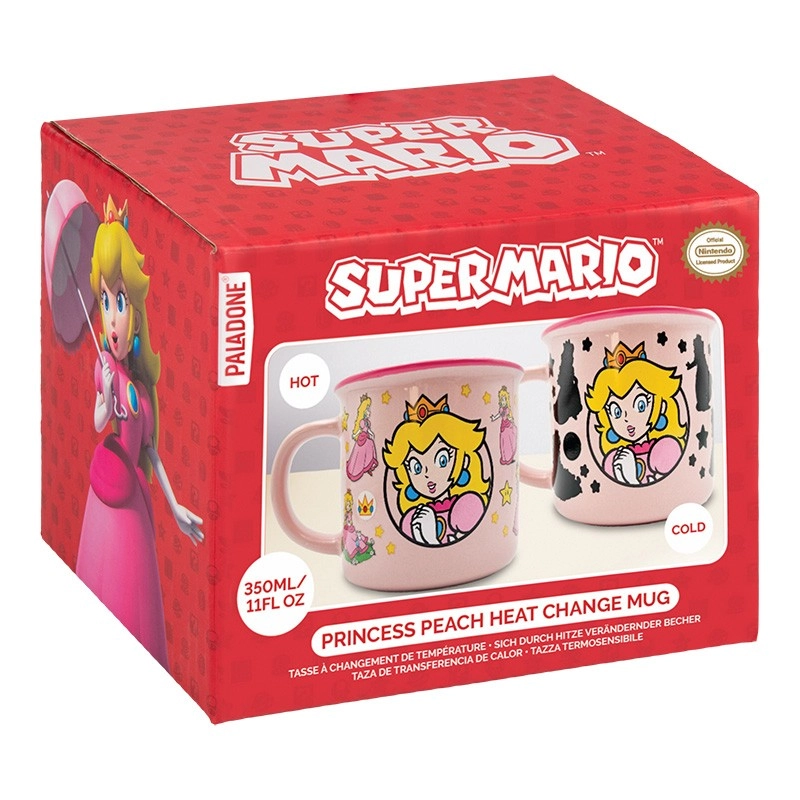 Elegante tazza termocromatica con motivo Princess Peach con capienza di 350 ml, perfetta per ogni fan del mondo di Super Mario. Versando una bevanda calda, il motivo si trasforma magicamente rivelando nuovi dettagli. Un regalo ideale per gamer e collezionisti.