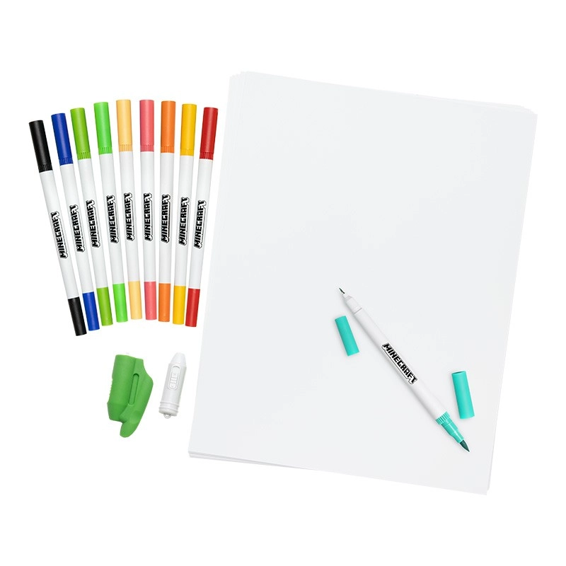 Il set include pennarelli leggeri a doppia punta, con punta fine e più larga per linee precise e sfumature fluide. Ideali per schizzi, ricalco e colorazione di soggetti Minecraft.