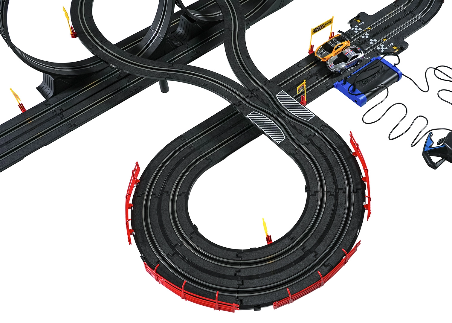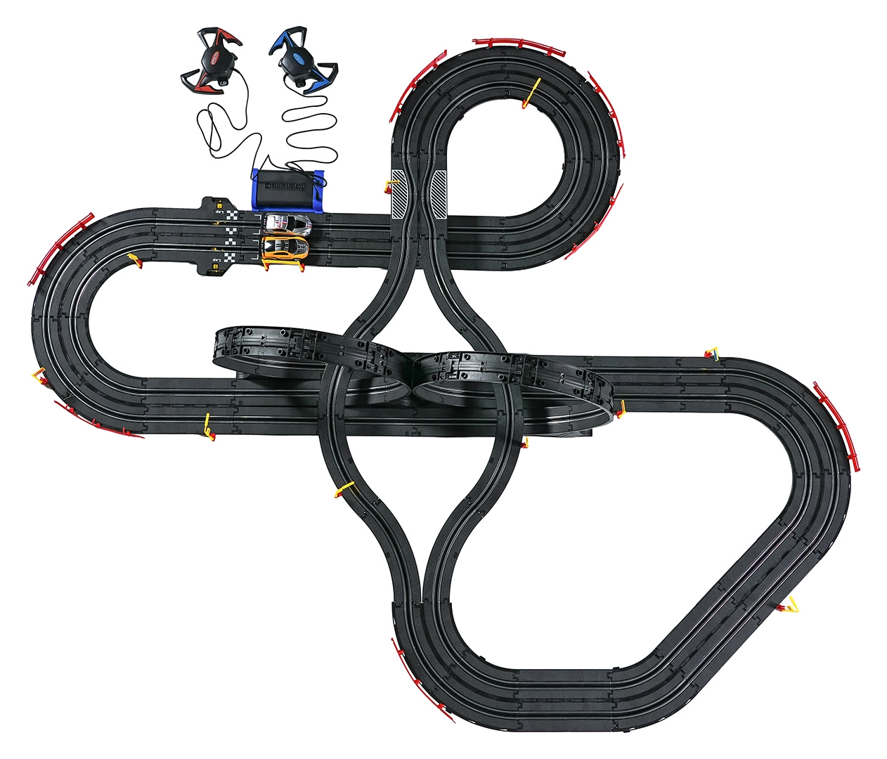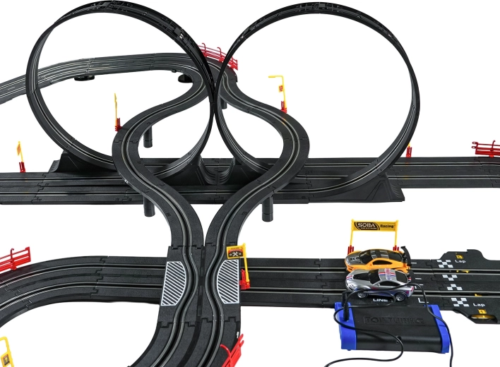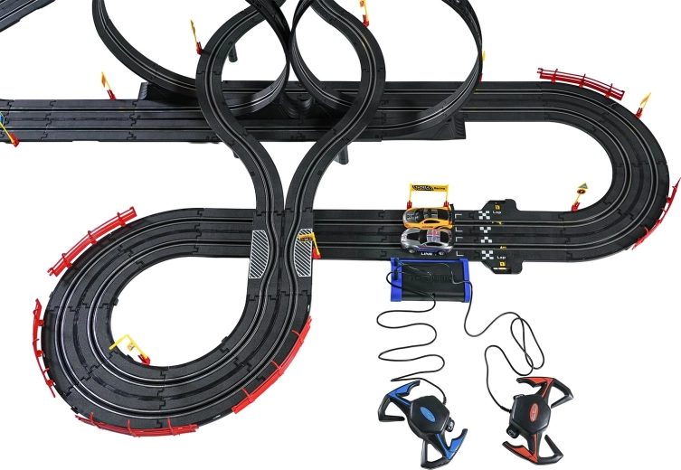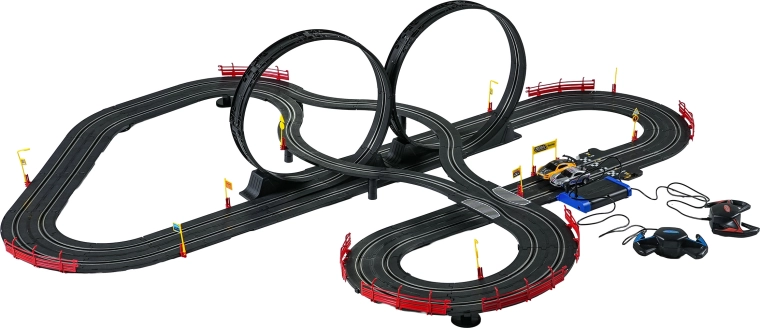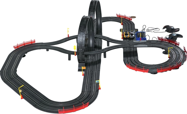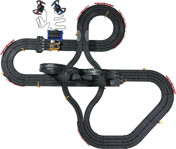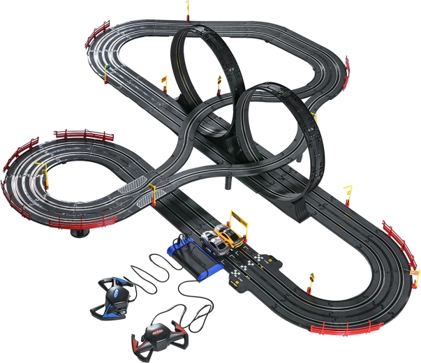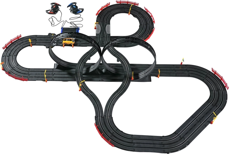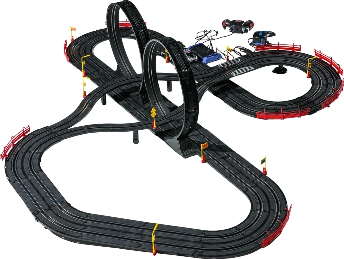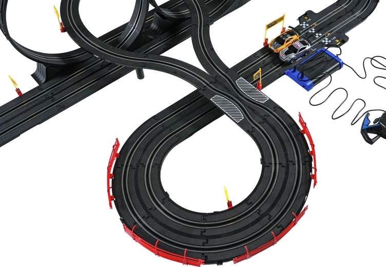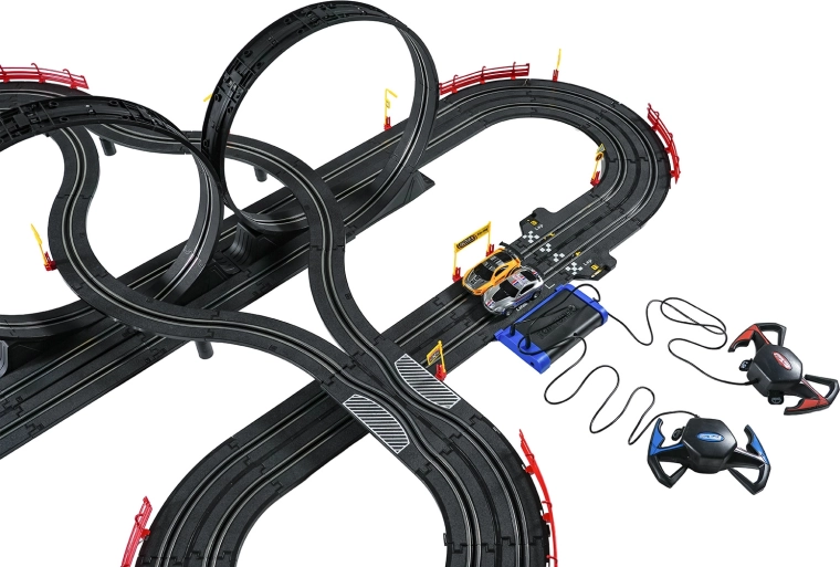 I moduli con guardrail di sicurezza garantiscono stabilità anche nelle sezioni più veloci. I due controller possono essere collegati alla base oppure alimentati a batterie, dandoti la libertà di gareggiare secondo le tue regole. Grazie al tracciato lungo c’è spazio per sorpassi, guida tattica e finali mozzafiato.