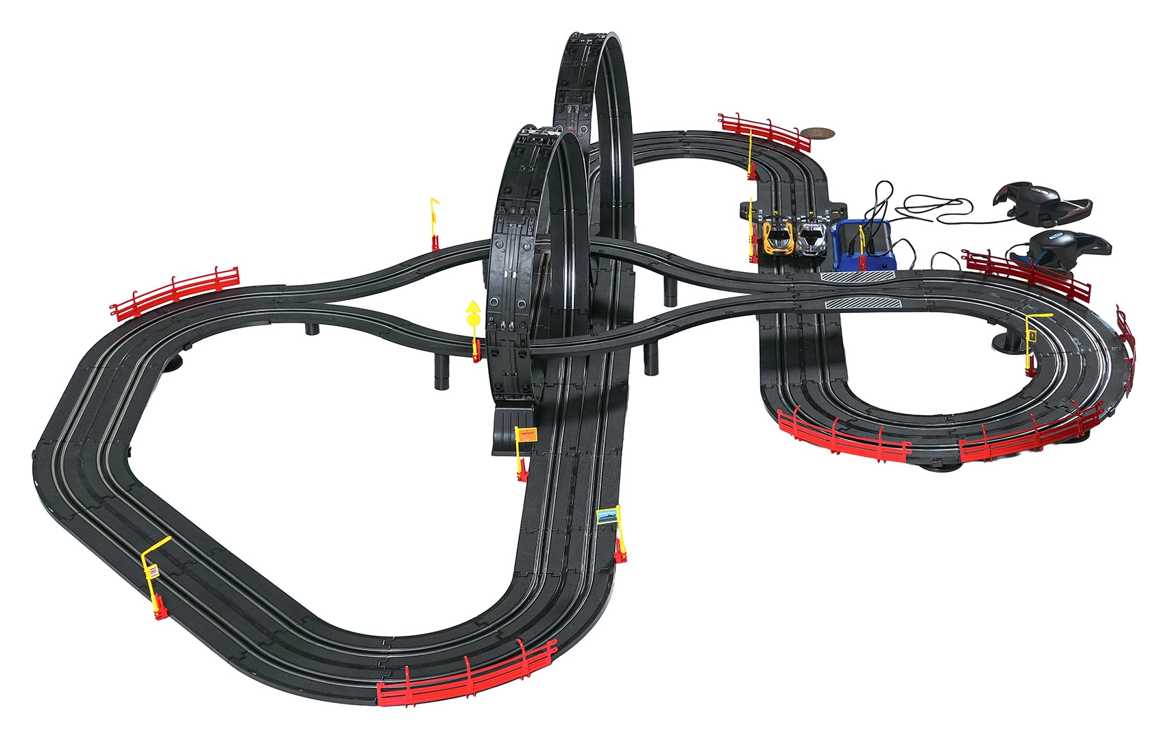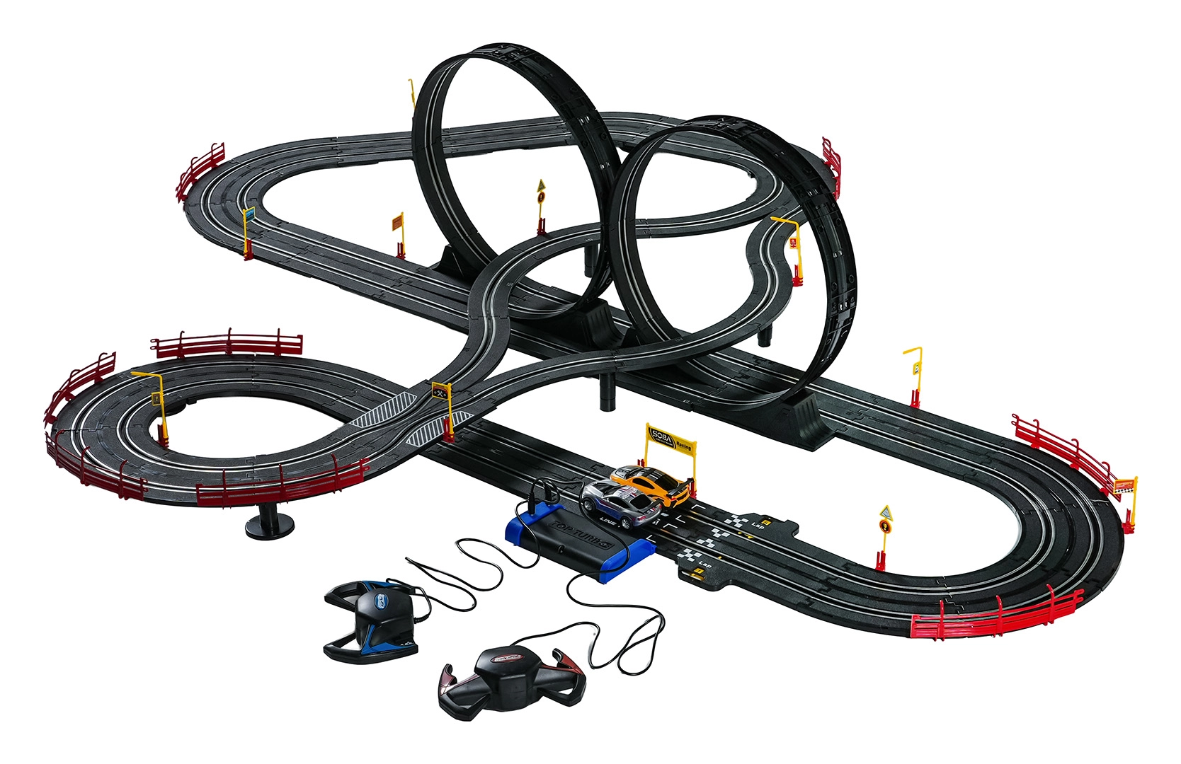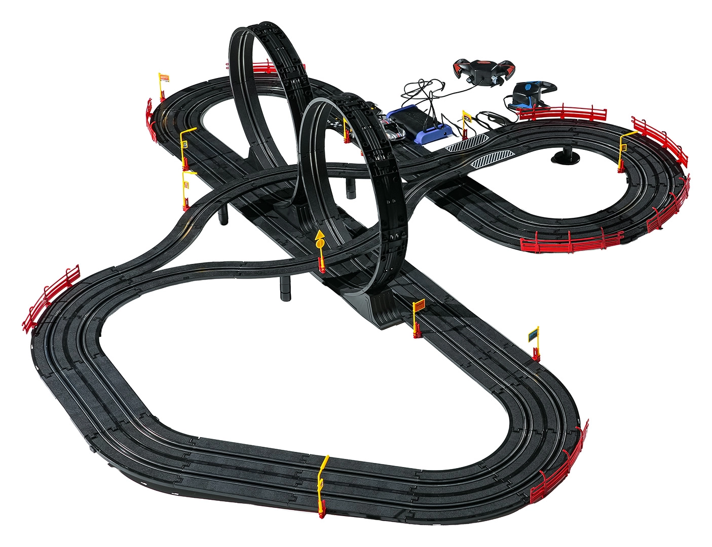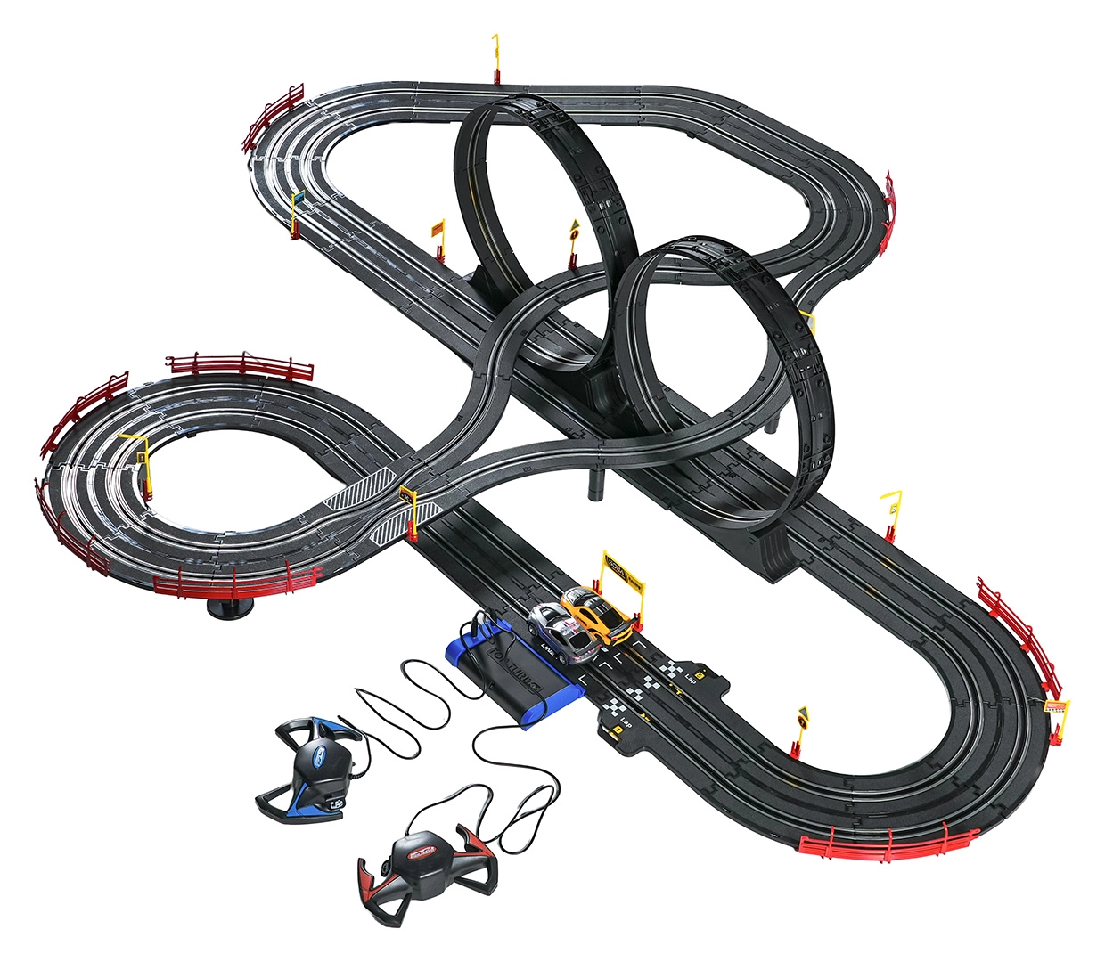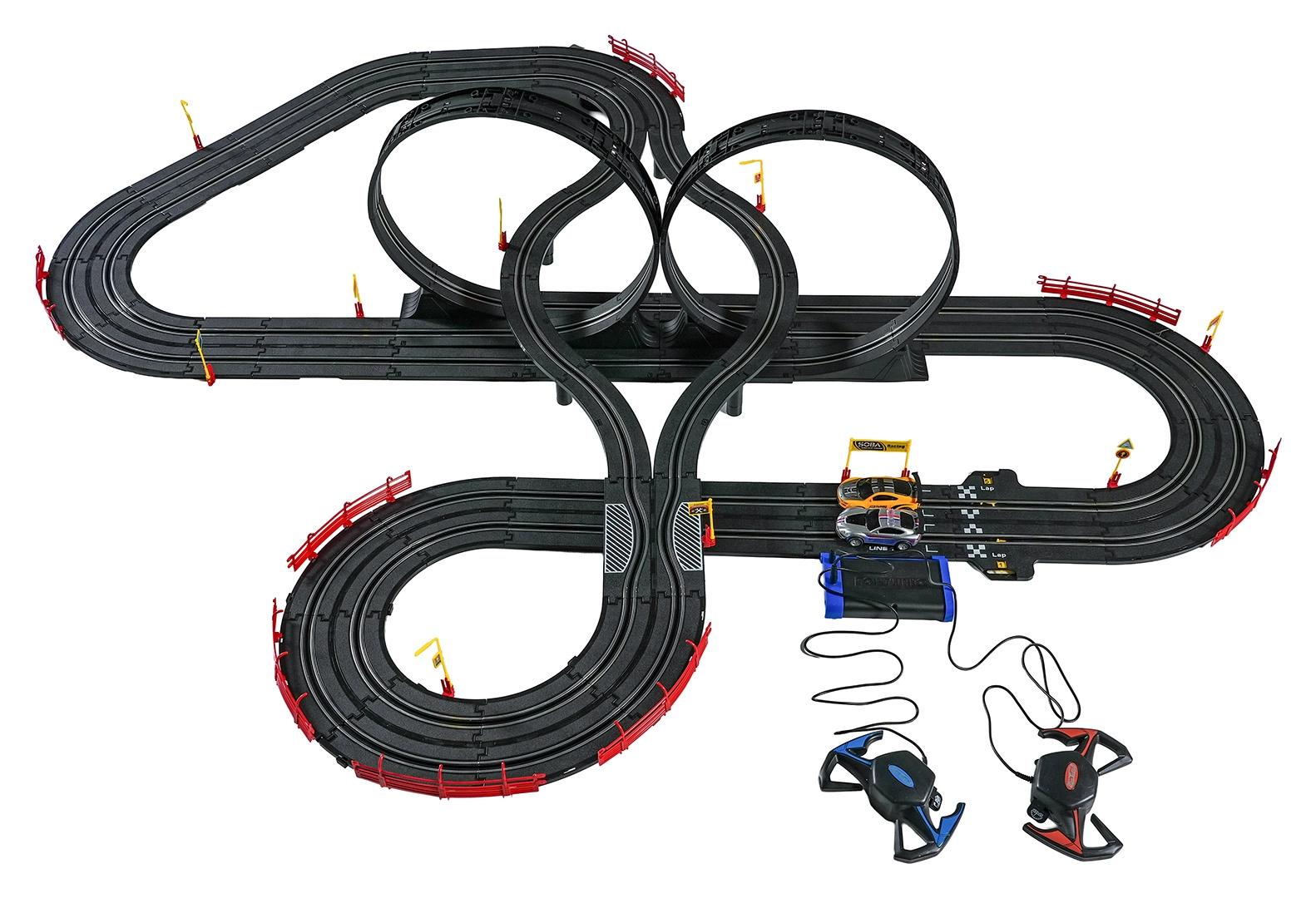 I moduli con guardrail di sicurezza garantiscono stabilità anche nelle sezioni più veloci. I due controller possono essere collegati alla base oppure alimentati a batterie, dandoti la libertà di gareggiare secondo le tue regole. Grazie al tracciato lungo c’è spazio per sorpassi, guida tattica e finali mozzafiato.