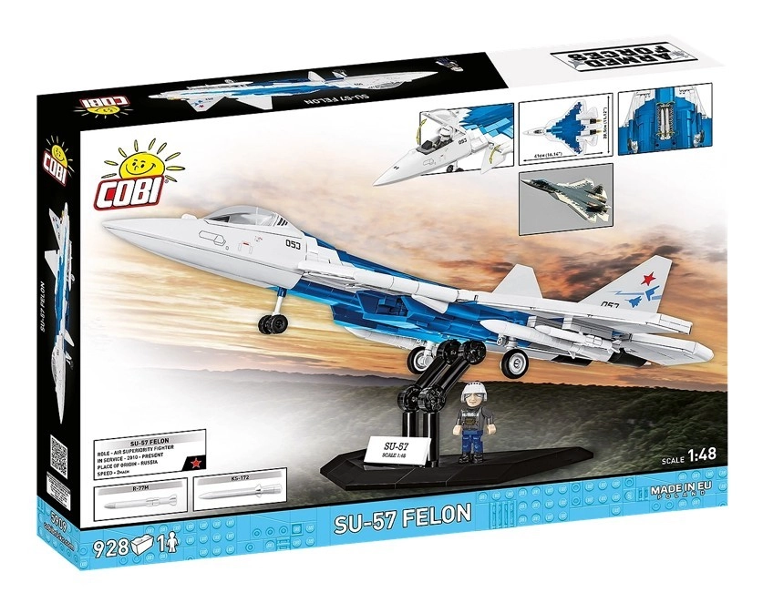 Costruisci il moderno caccia di quinta generazione SU-57 Felon con mattoncini COBI di alta qualità. Il set da 928 pezzi in scala 1:48 offre mimetica dettagliata, cabina apribile, elementi mobili e minifigure del pilota. Perfetto per collezionisti e appassionati di aviazione moderna, incluso supporto con targhetta per un’esposizione accattivante.