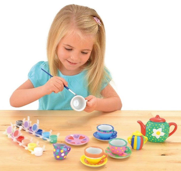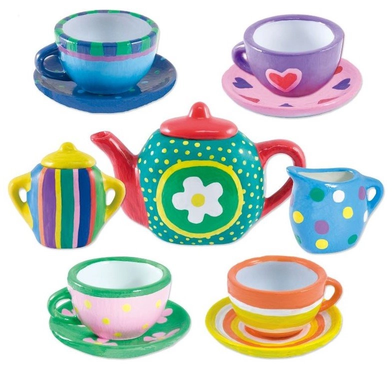 Il set include una teiera, 4 tazze con piattini, una zuccheriera e una lattiera – perfetto per la creazione artistica e per giocare poi al tè delle cinque.