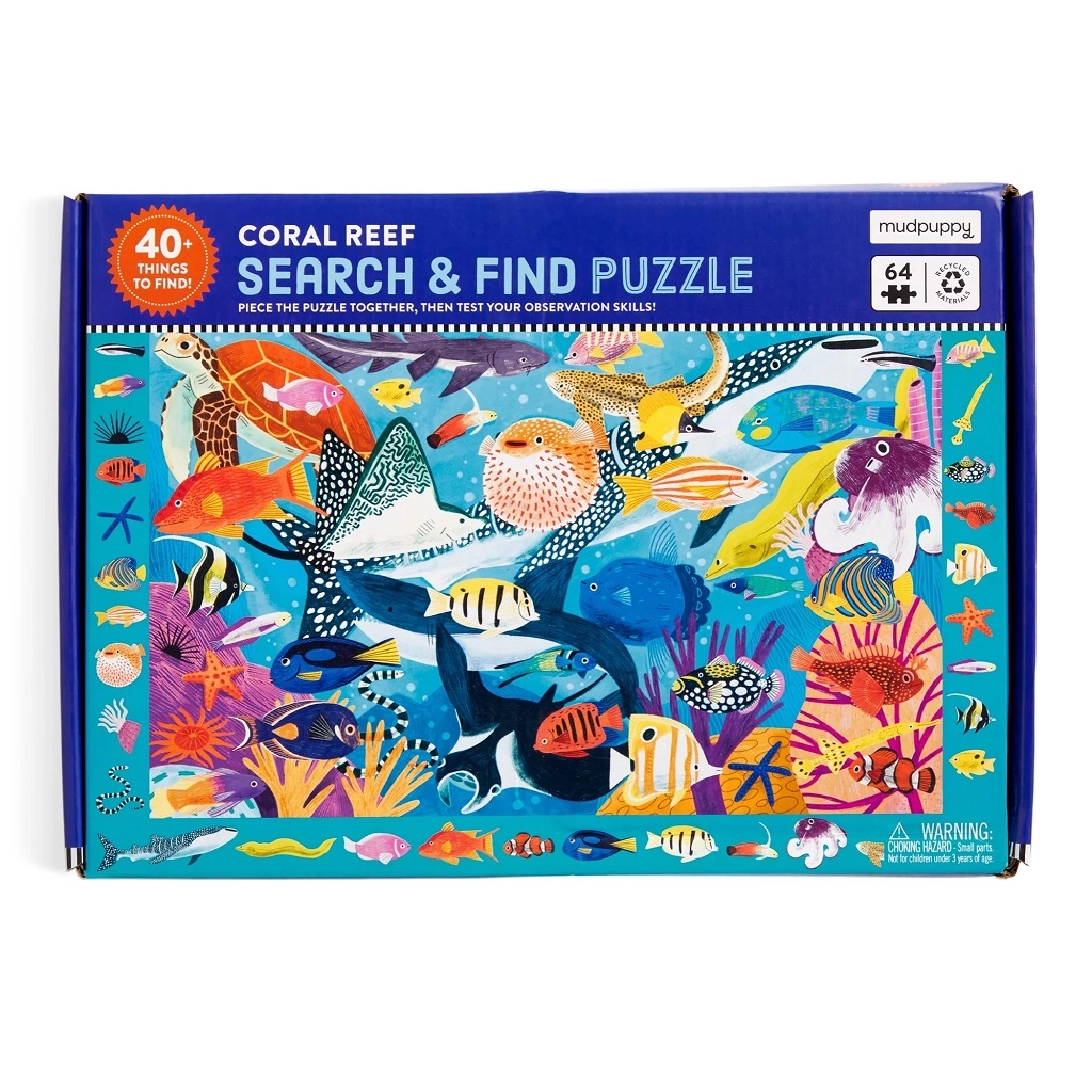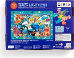 Tuffati in un oceano di colori! Il bellissimo puzzle illustrato con il tema della barriera corallina, dell’artista Hannah Abbo, porta non solo divertimento ma anche apprendimento. Dopo aver completato l’immagine, i bambini possono cercare oltre 40 oggetti seguendo i bordi, sviluppando capacità di osservazione, pazienza e motricità fine.