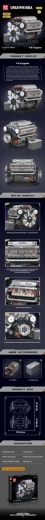 Il modello è dotato di motore elettrico L e vano di alimentazione per 6× AAA 1,5 V (batterie non incluse). Una volta assemblato, si mettono in moto le parti mobili – distribuzione valvole, preciso movimento dei pistoni, turbocompressore e scarico – per un’affascinante dimostrazione del funzionamento di un vero motore.
