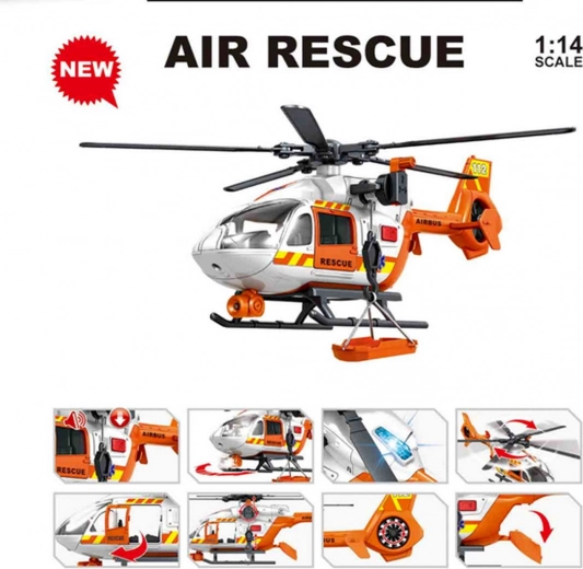 I bambini apprezzeranno le porte laterali e lo sportello posteriore apribili, il gancio mobile con cesta di trasporto e i rotori pieghevoli e rotanti. Le luci LED anteriori, superiori e in cabina, insieme ai suoni autentici di volo e allarme, esaltano l’atmosfera delle operazioni di soccorso. L’elicottero è alimentato da 2× AAA (incluse).